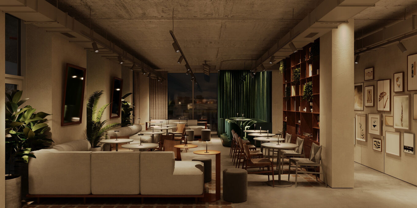 “Нашою великою ідеєю було створити місце, яке стане «своїм» для гостей з різними інтересами. Для цього ми організували простір так, аби в ньому було однаково комфортно поснідати великою компанією, попрацювати за ноутбуком і скоротати вечір за баром. В інтер’єрі закладу багато світла, зелені й натуральних матеріалів, а також дрібка неону, який привертатиме увагу перехожих ще з вулиці”, – коментує проєкт команда balbek bureau.