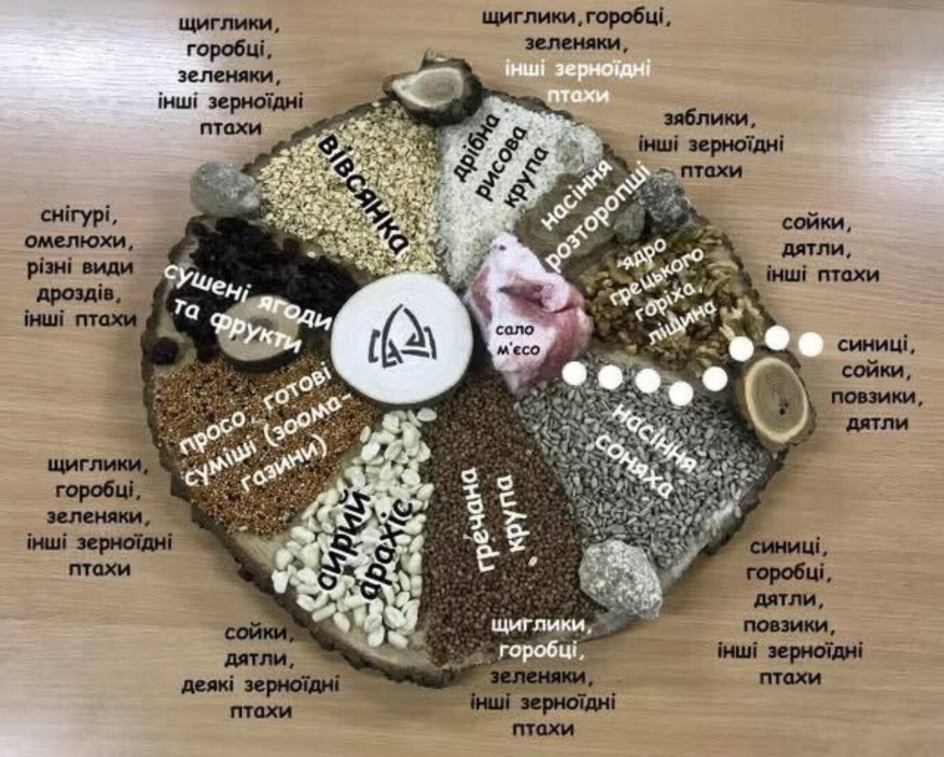 Тарілка з різними видами їжі для пташок. Тут різноманітне насіння, крупи, сало, м’ясо та ягоди, біля кожного вказані види птахів, які харчуються такою їжею. Зображення: Львівська міська рада
