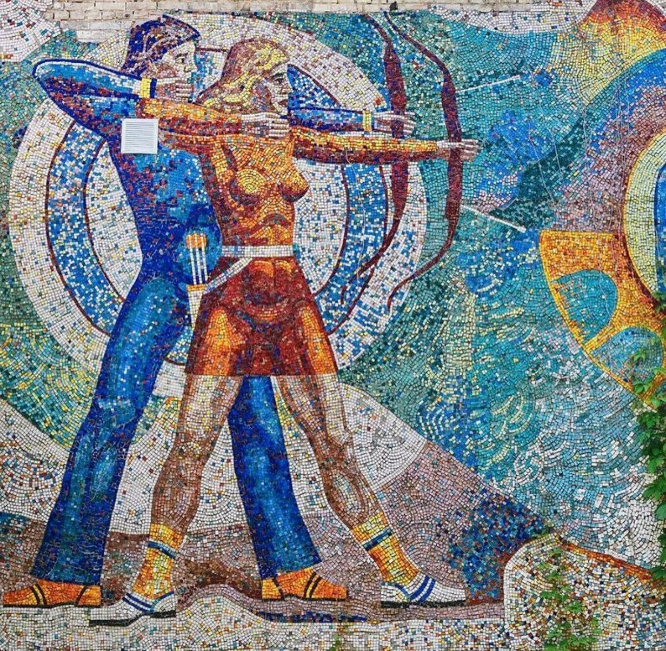 20-метрова модерністська мозаїка розташована на вул. Клепарівській, 39а та має охоронний статус. Її у 1984-1986 роках створила група художників на чолі з Ігорем Сиротинським. В оригіналі панно складалося з трьох частин та зображувало велотрек, стрільбу з луку, важку атлетику, біг, футбол, гімнастику та багато інших сюжетів.