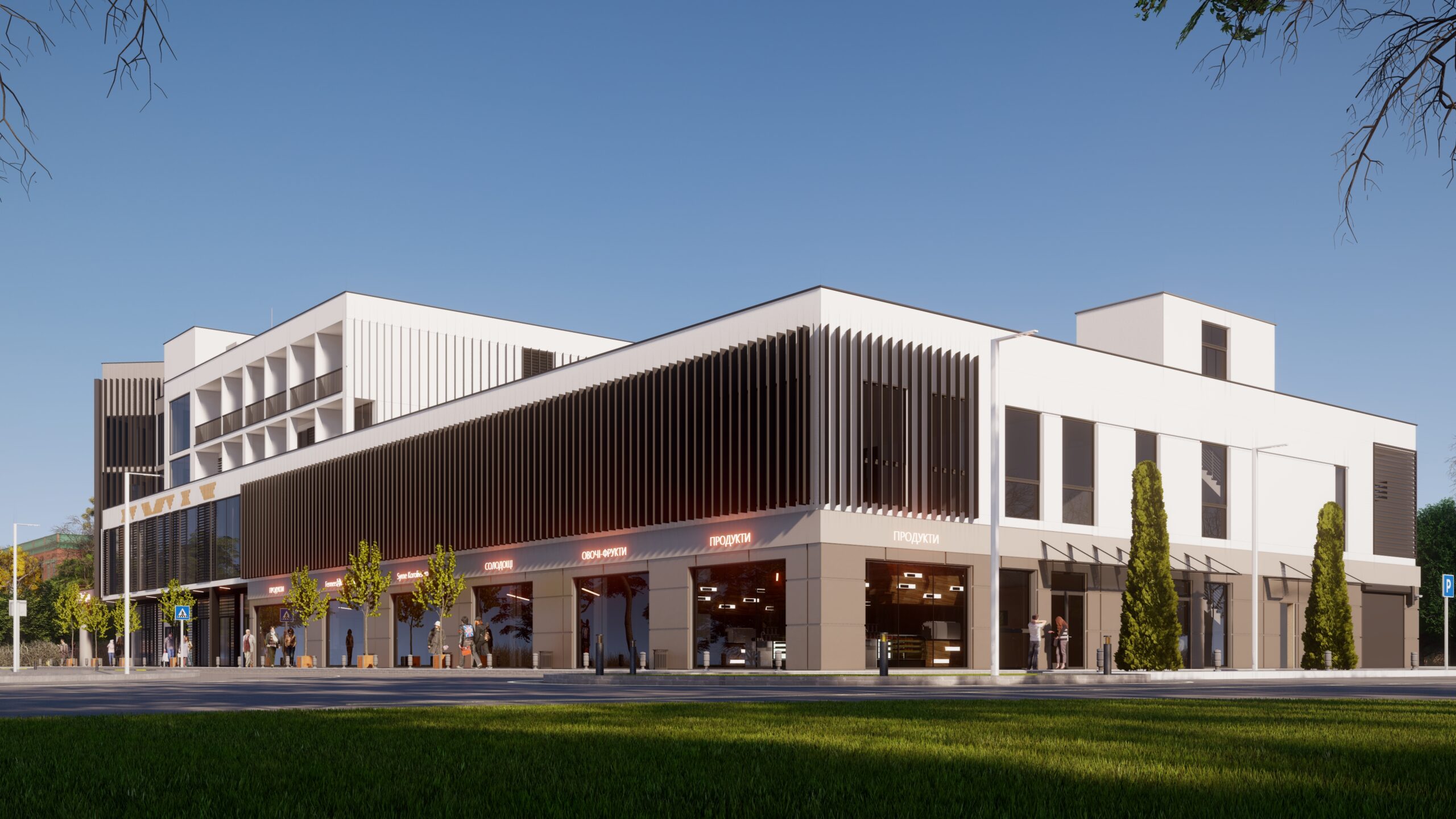 Також в будівлі облаштують заклад торгівлі, невеличкий готель, офісні приміщення й інші сервіси, такі як зали очкування. Водночас на ділянці буде підземний паркінг, який дасть можливість припаркуватися.
