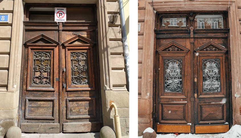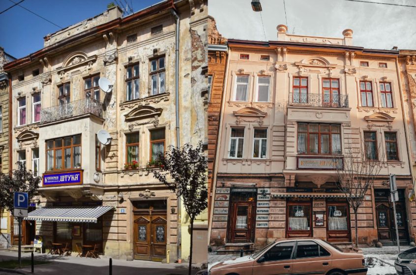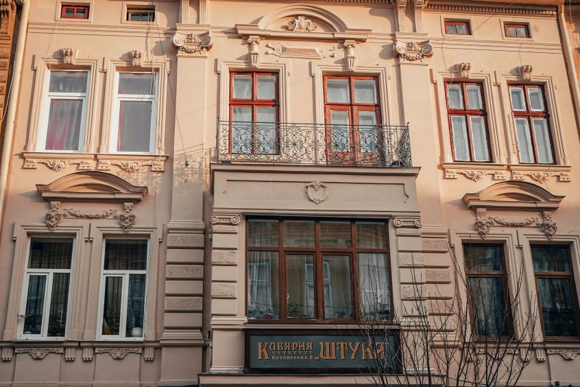 “Роботи ми виконали згідно з паспортом опорядження фасаду. Також на рівні першого поверху ми залишили відкритими відреставровані (ще коли відкривали кав’ярню) студентами Академії Труша автентичні написи ”, додає Євген Булавін.