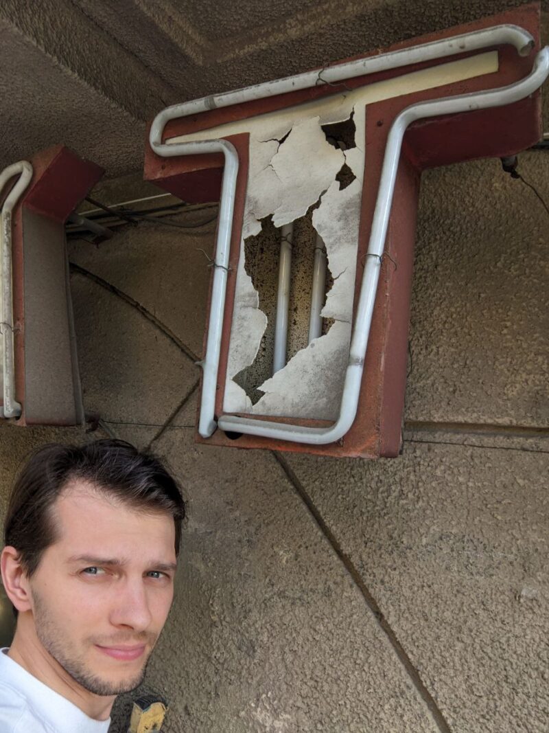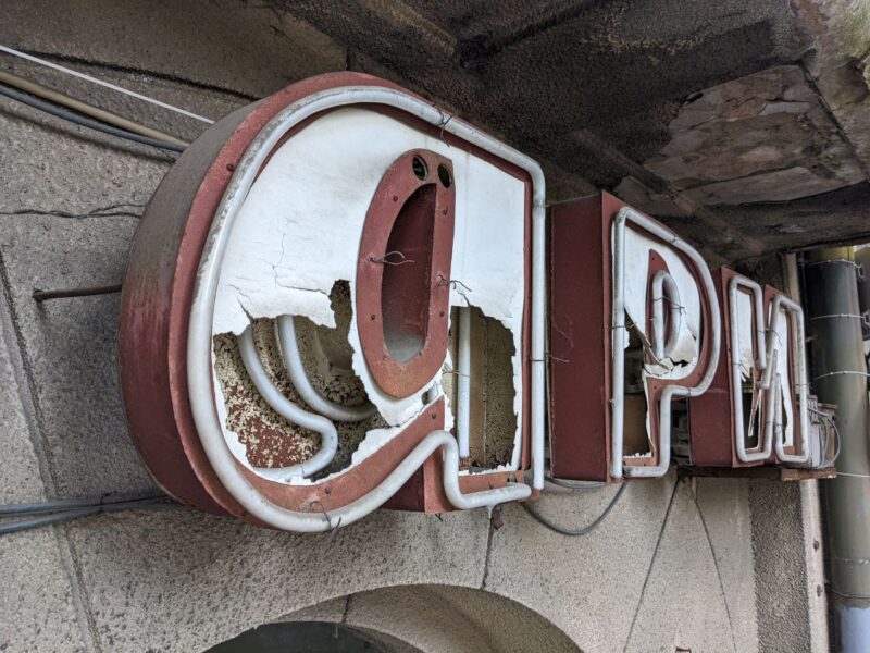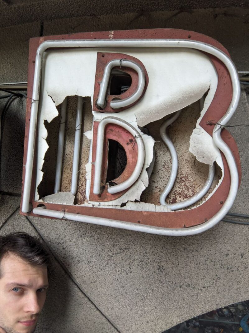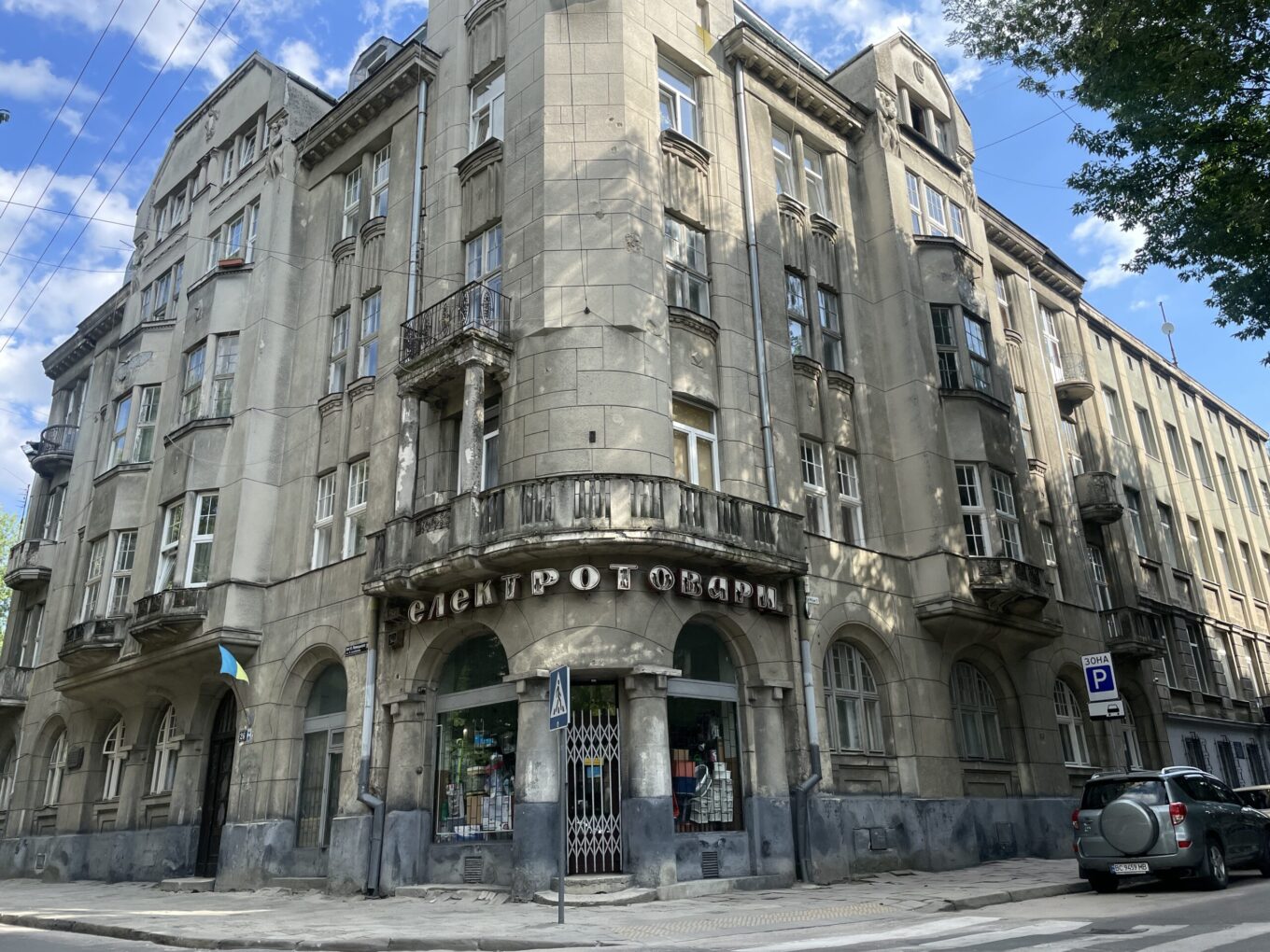 розміщення під наріжним балконом, що захищає від прямого попадання опадів чи сонячних променів. Втім, цього недостатньо, архітектурним елементам такого штибу теж потрібен техогляд. 50 років — великий термін для пластику, за цей час він зносився і розсипається від найменшого контакту, також неони не працюють. Найбільше пошкоджень на правій частині, букви із цієї сторони місцями наскрізь діряві», — ділиться висновком консультант проєкту, архітектор бюро RePlus Іван Маркович.