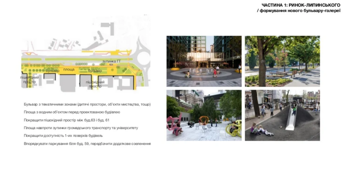 “Сформуємо громадські простори для різних верств, також буде додаткове озеленення – дерева, кущі. Простори будуть для дітей і для підлітків, можливо також для скейтерів і для дорослих. Також плануємо систему дощових садків, специфічних ландшафтних рішень, які дозволять покращити дренаж, щоб вулицю не затоплювало під час дощів. Також на бульварі будуть мистецькі елементи, це задасть культурний образ цьому простору”, – розповідає головний архітектор Львова.