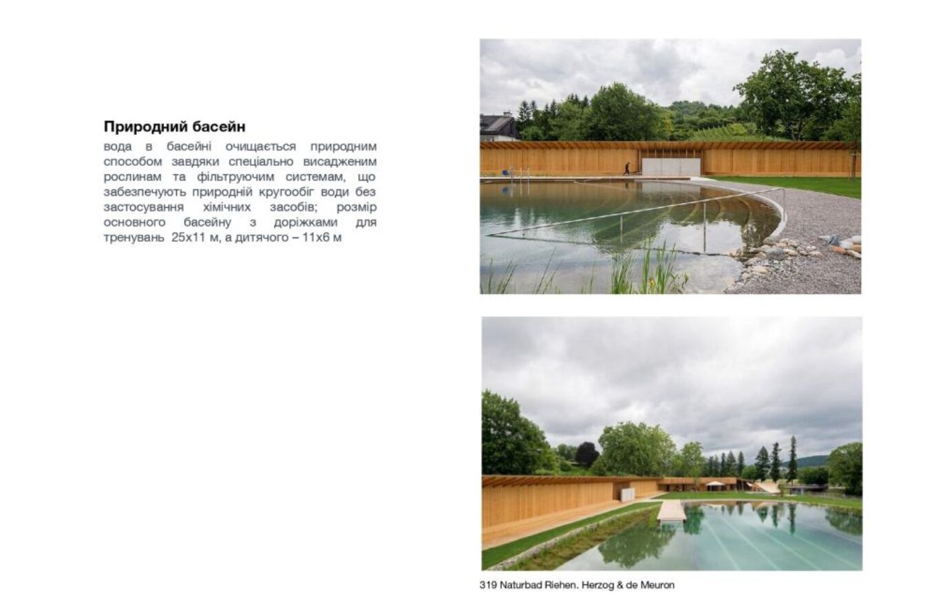 “Також тут буде громадський простір: все з екологічних матеріалів, дренуючі поверхні, максимум природних елементів і дерева. Ми так само вважаємо, що тут, враховуючи добру інсоляцію та відкритість об’єкту, можна сформувати не стандартний, а природний басейн”, – розповів Антон Коломєйцев.