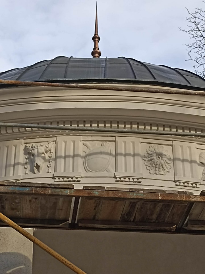 Наразі вже відреставровані дах, карнизи й античні колони. Плитку вмощують білим та червоним пісковиком. На даху альтанки встановили мідний шпиль заввишки понад 2 метри.