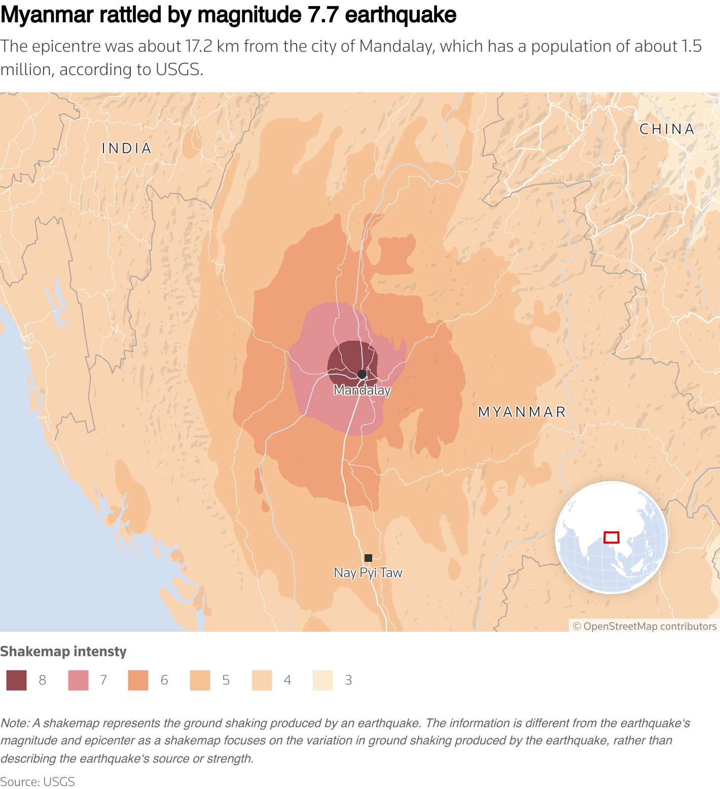 Зазначається, що землетрус був неглибоким, його осередок знаходився на глибині лише 10 км. Епіцентр розташований поблизу міста Мандалай, за 50 км на схід від Моніви.