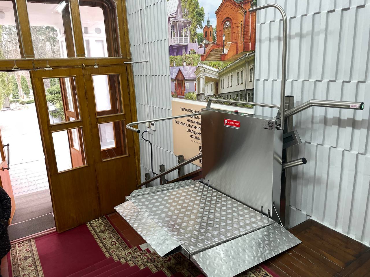 Наразі на сходах встановлена підіймальна платформа вантажопідйомністю 150 кілограмів. На неї можна легко зайти, або ж заїхати у колісному кріслі, опустити поручні й затиснути кнопки «вгору» або «вниз». Коли ж підіймачем не користуються, платформу підіймають до стіни.