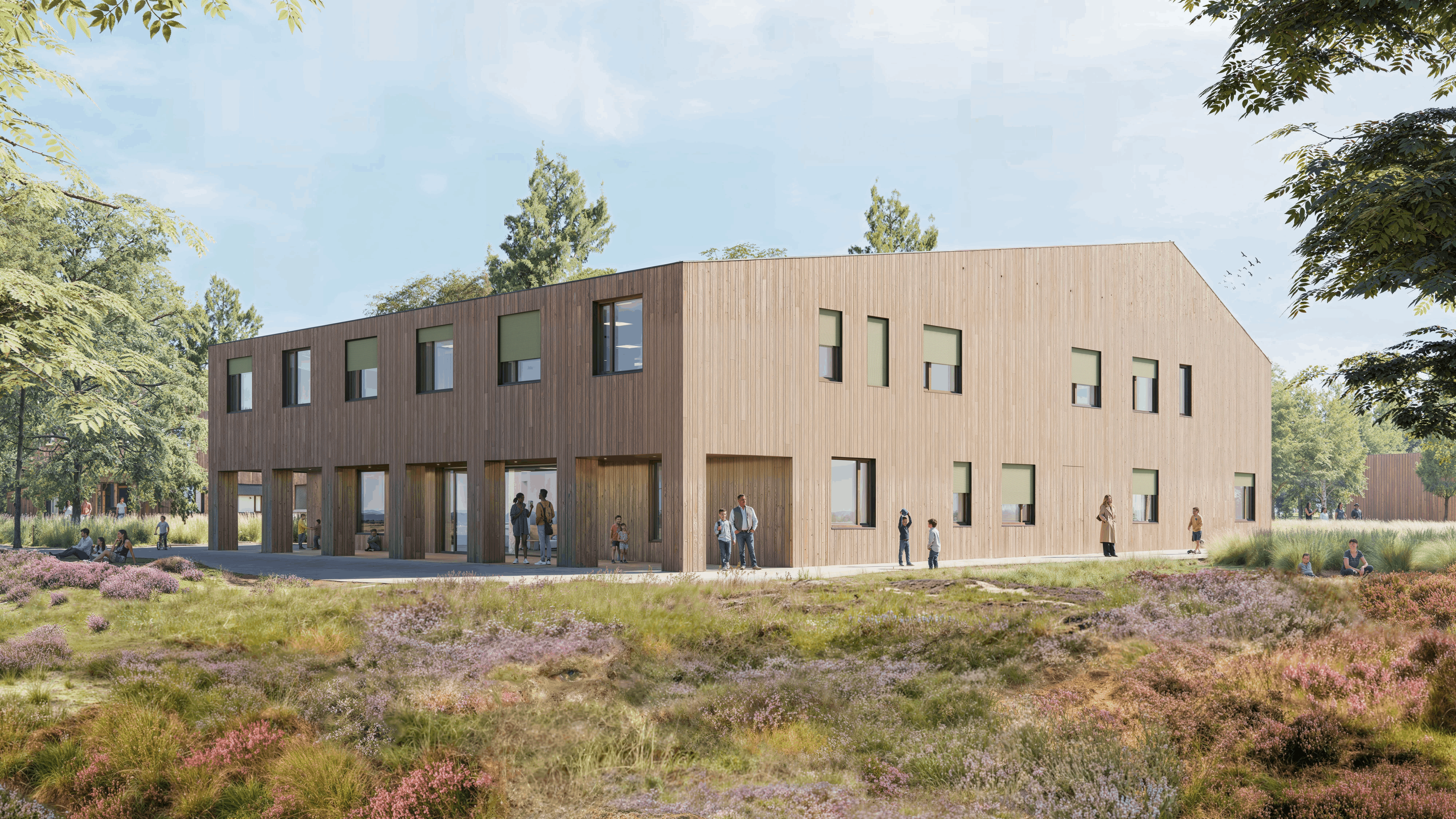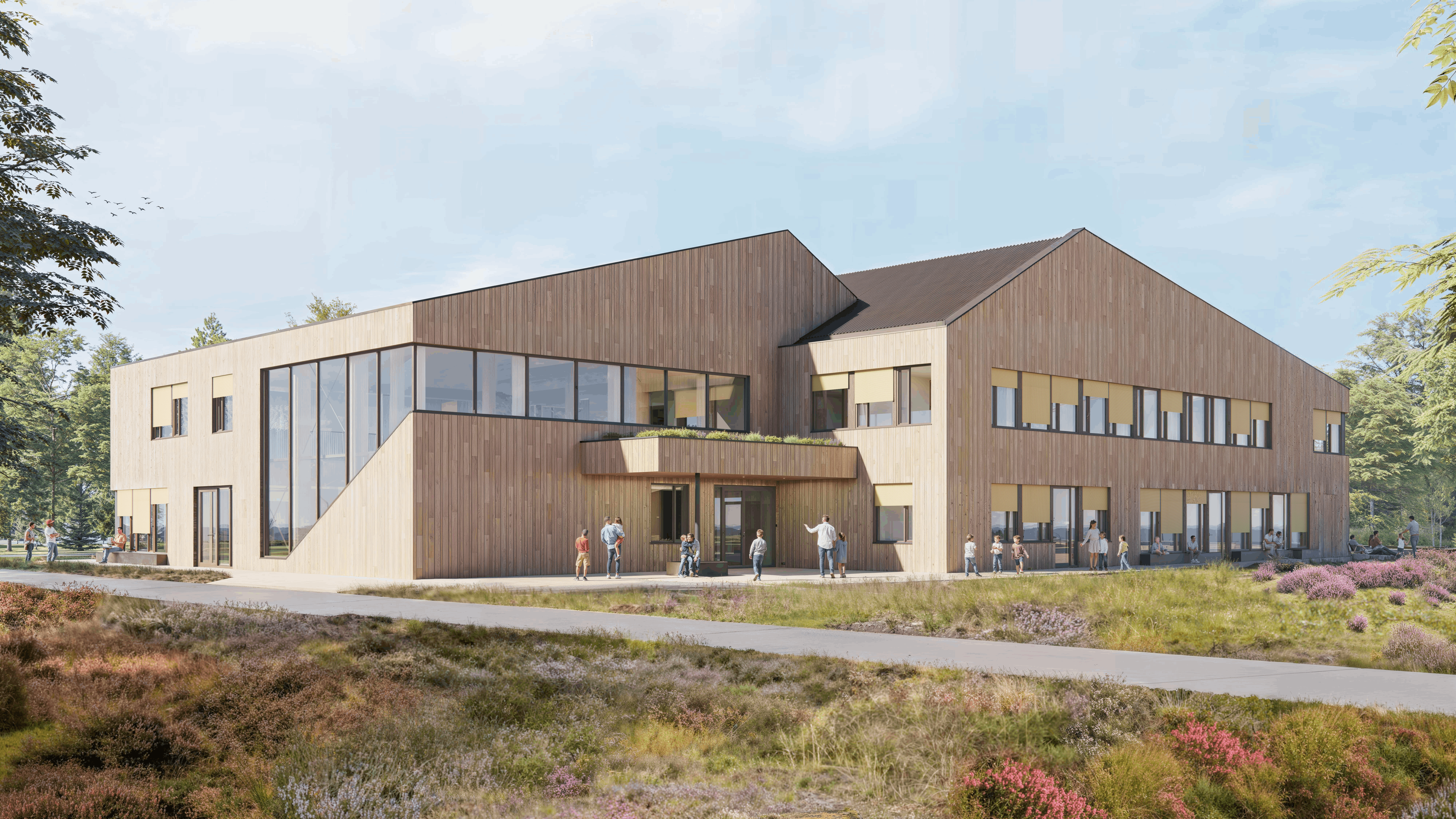Будівлі вирізняються різними кольоровими палітрами для зручної навігації, великими скляними прорізами та дерев’яними фасадами, що створюють атмосферу безпеки й відкритості як для мешканців, так і для місцевої громади.