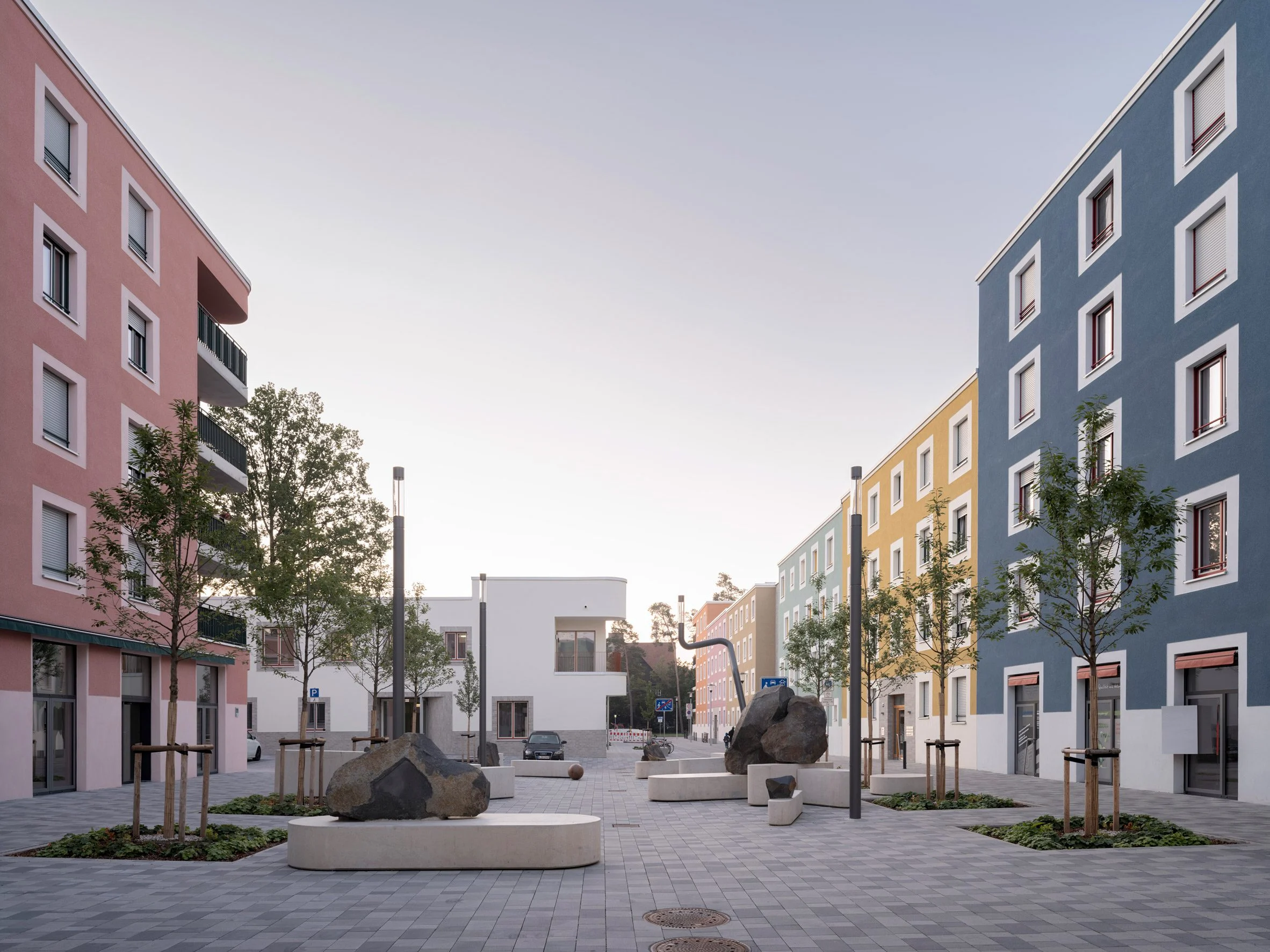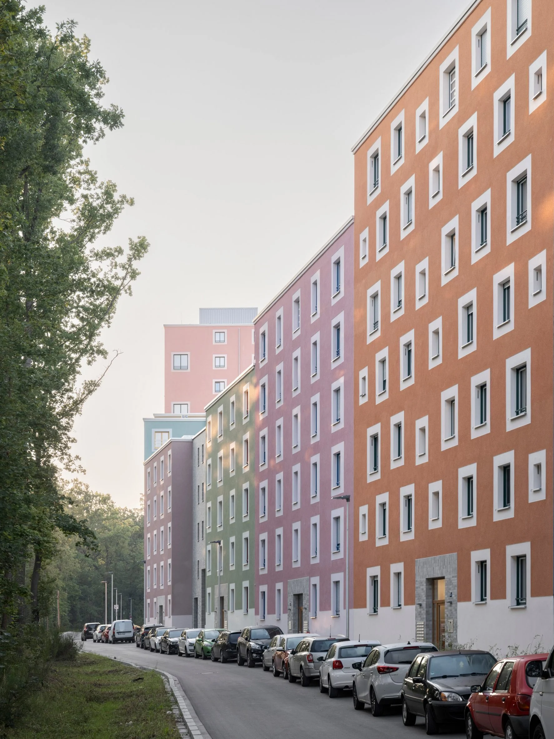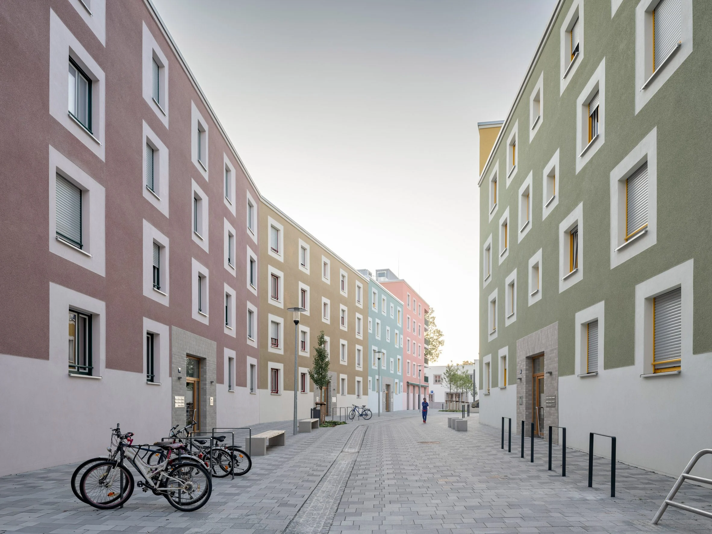 Кожен будинок має різну висотність, фасади оздоблені кольоровою мінеральною штукатуркою. Фото: Marcus Bredt
