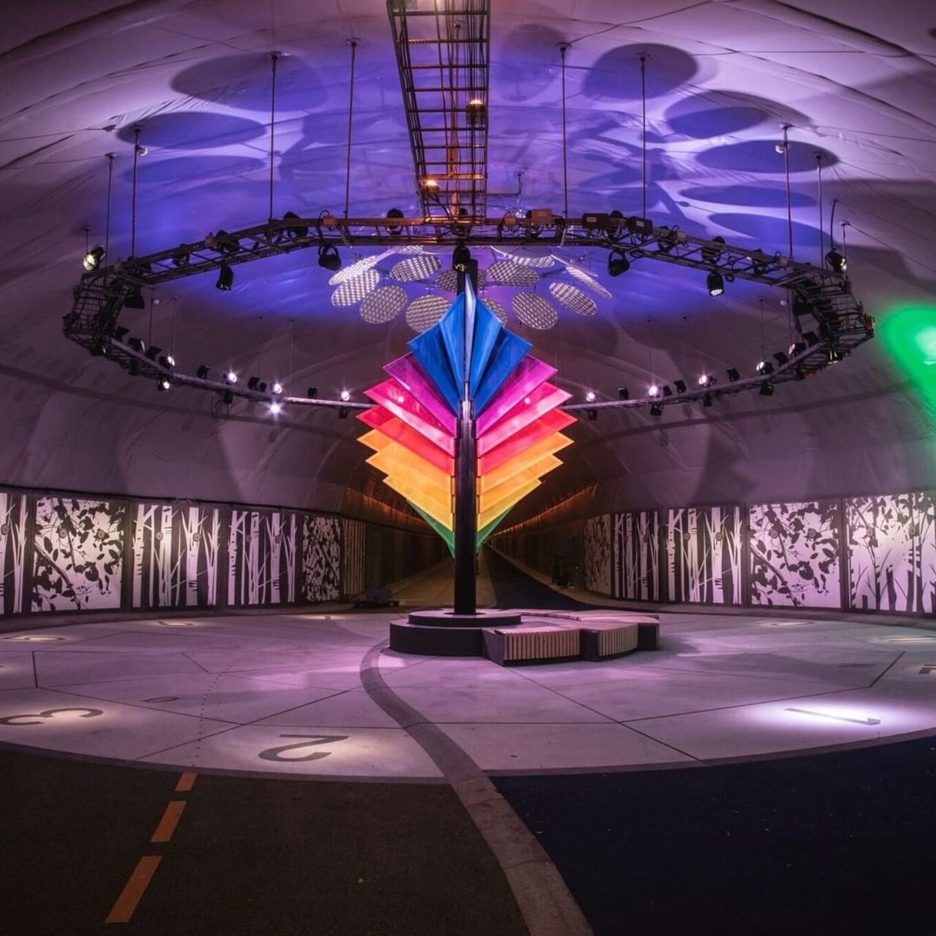 Всередині розміщене кольорове освітлення, твори мистецтва та інсталяції, щоб зробити подорож цікавішою.
