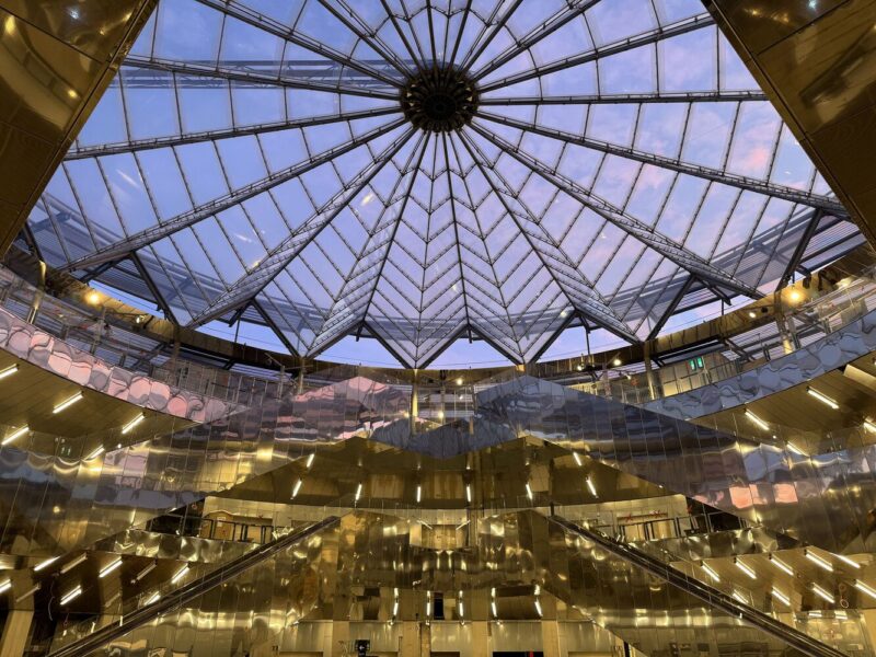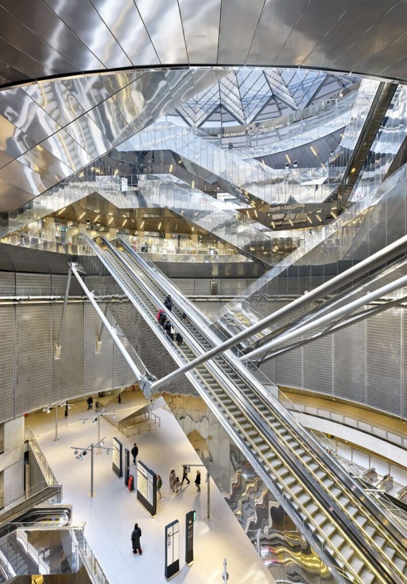 Конструктивно станція являє собою відкритий бетонний циліндр діаметром 70 метрів, який архітектор назвав “перевернутим хмарочосом”. Усередині нього розташовані галереї, балкони, містки та ескалатори, які забезпечують легке пересування між рівнями.