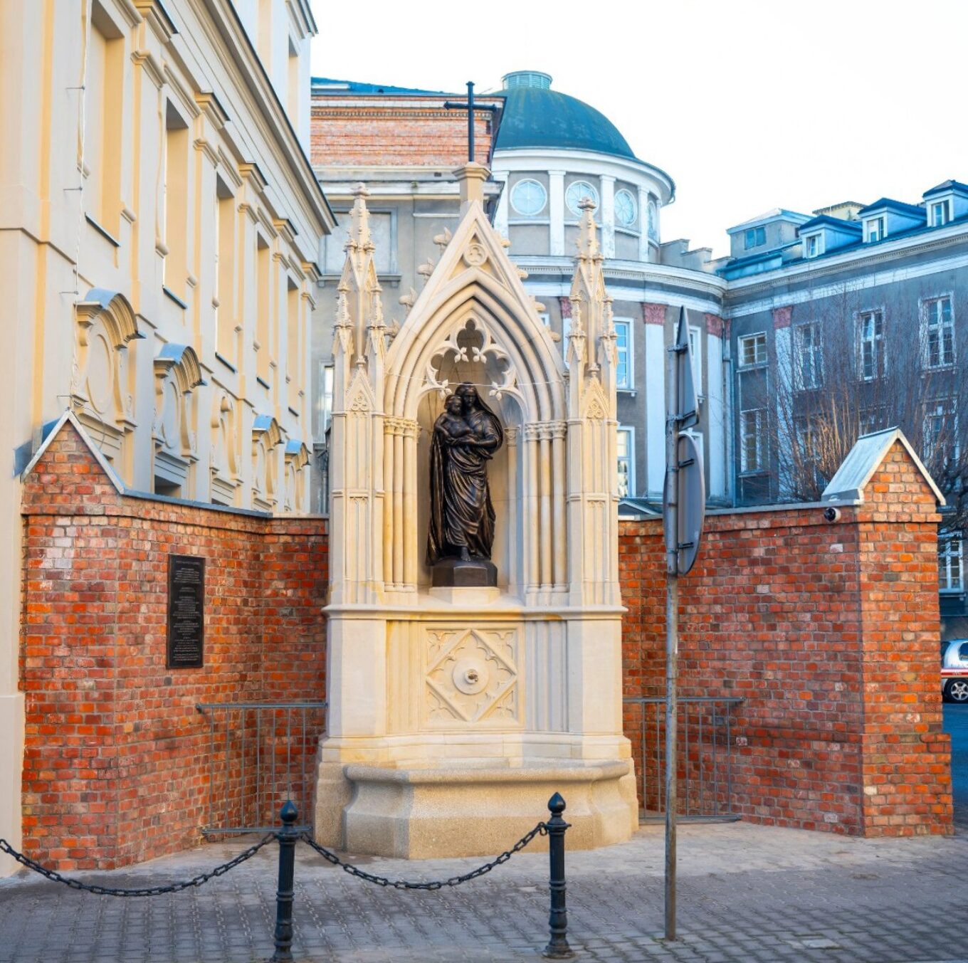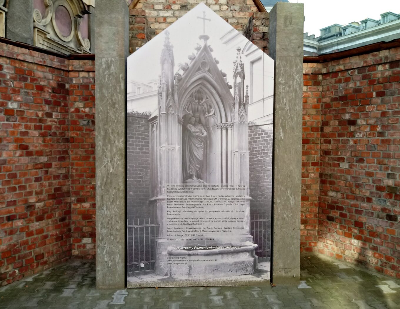 Фігуру Мадонни створив скульптор Марцін Собчак, а кам’яну неоготичну капличку відтворив Марек Зелонька. Варто зазначити, що нова криниця розташована не точно на місці оригіналу: її довелося зсунути трохи на схід через конфлікт із в’їздом на територію лікарні.