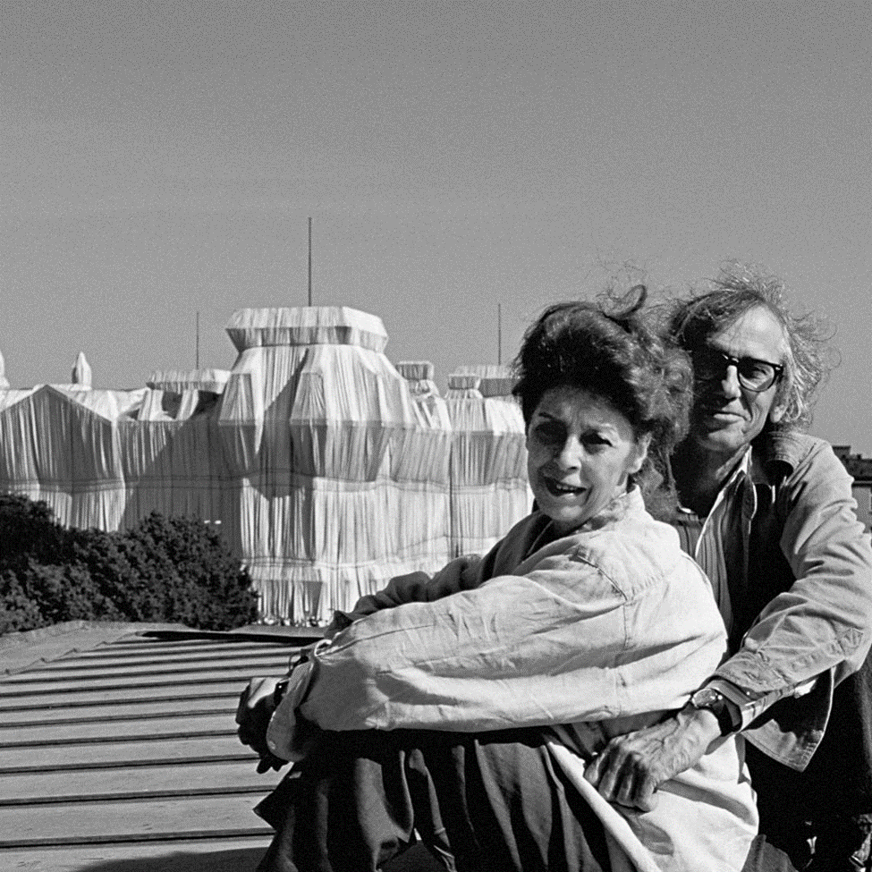 Христо Явашев і Жанна-Клод де Гієбон біля обернутого у тканину Рейхстагу. Фото: @christojeanneclaude
