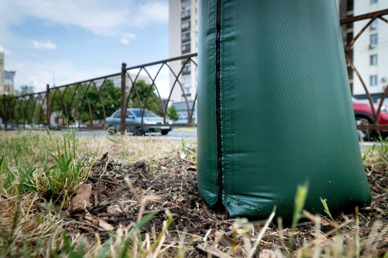 Завдяки спеціальному матеріалу, вода в торбинках не перегрівається та забезпечує деревам оптимальну температуру поливу. Фото: Олександр Возний