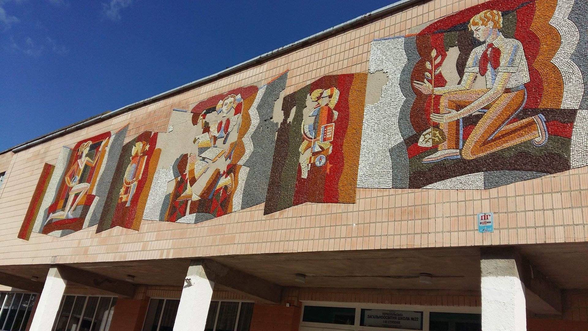 Фасад школи № 22 прикрасили мозаїкою ще в 1986 році. На ній зображені школярі в піонерських краватках. За 31 рік мозаїку жодного разу не реставрували. Тому вона місцями обсипалась, особливо — у центральній частині.