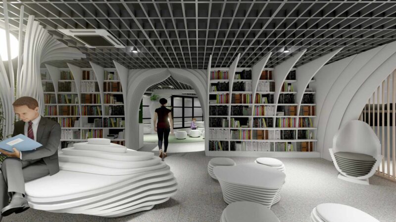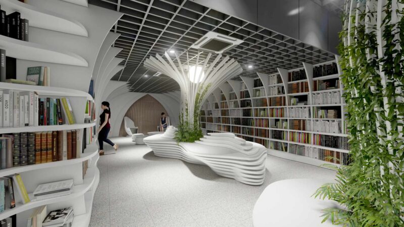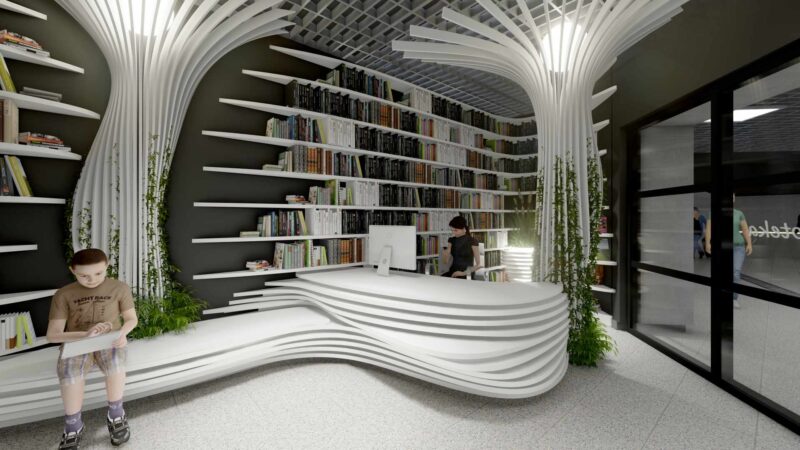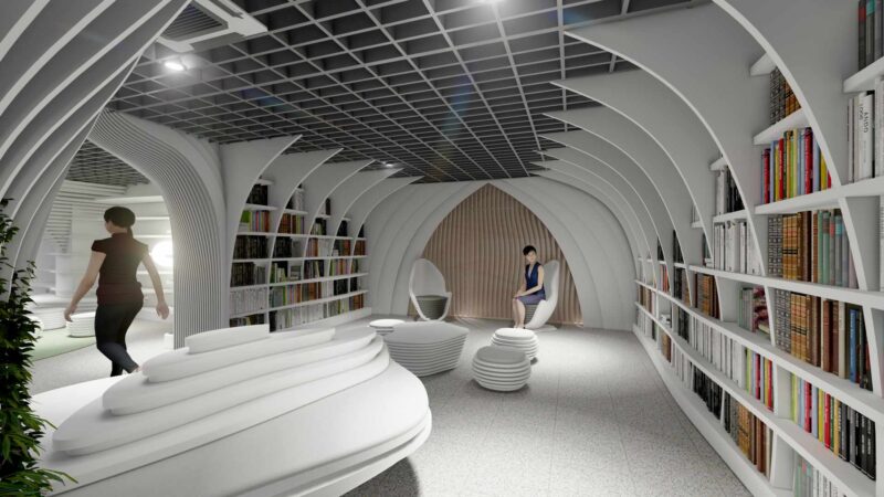 Простір бібліотеки матиме відкрите планування, а дизайн меблів буде базуватись на сучасних параметричних технологіях. Полиці “Метротеки” будуть мати вигляд стрічок з унікальним хвилястим візерунком, що тягнуться вздовж кімнат.