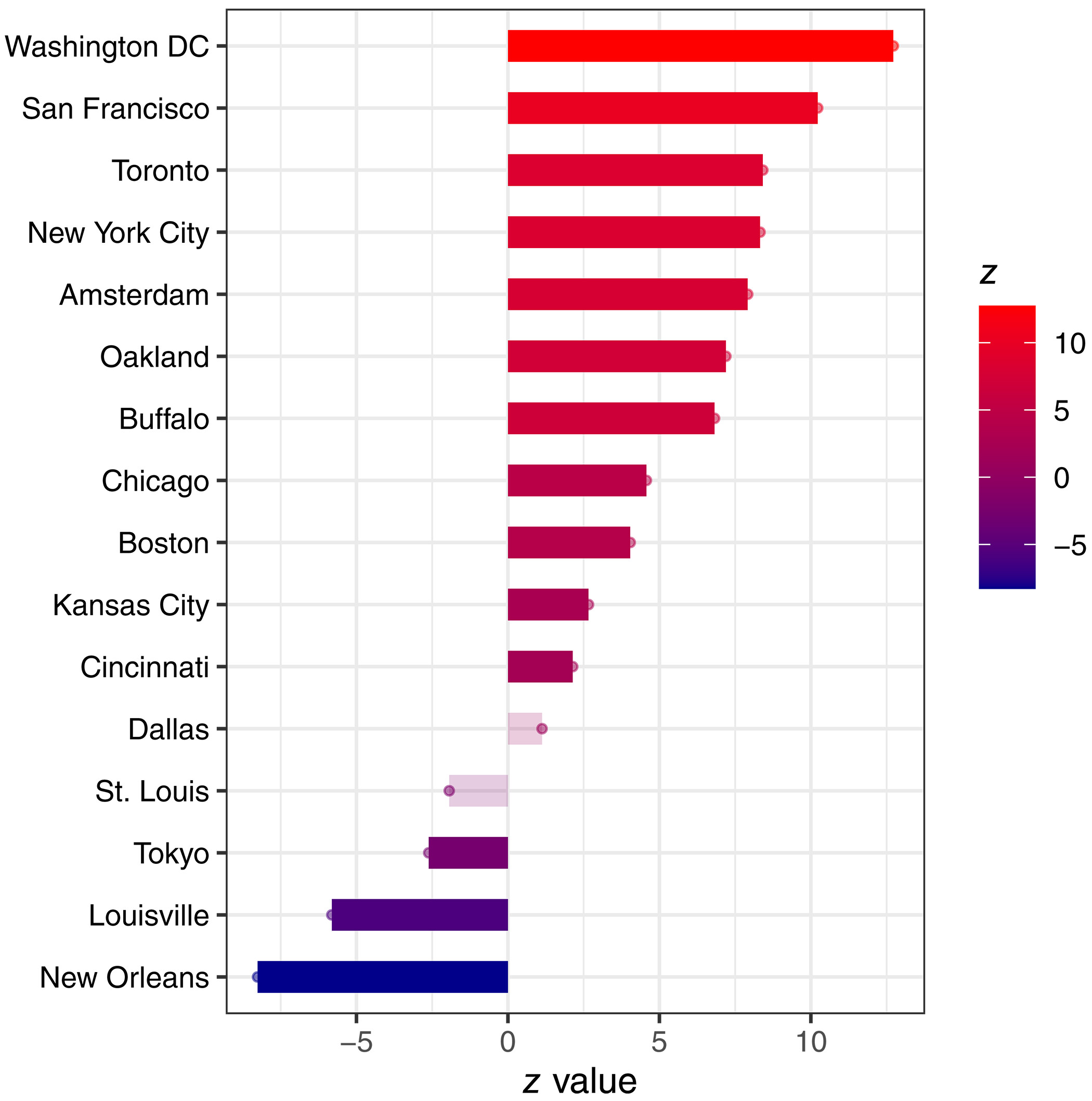 Лише в трьох містах спостерігалися значні тенденції до зниження популяції – Токіо, Луїсвілль та Новий Орлеан.