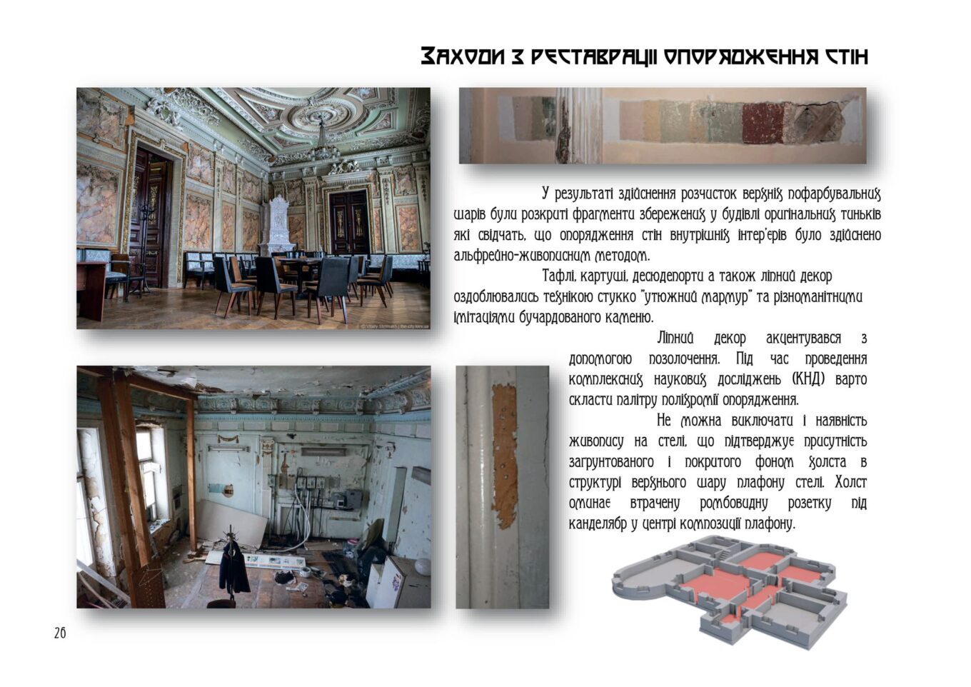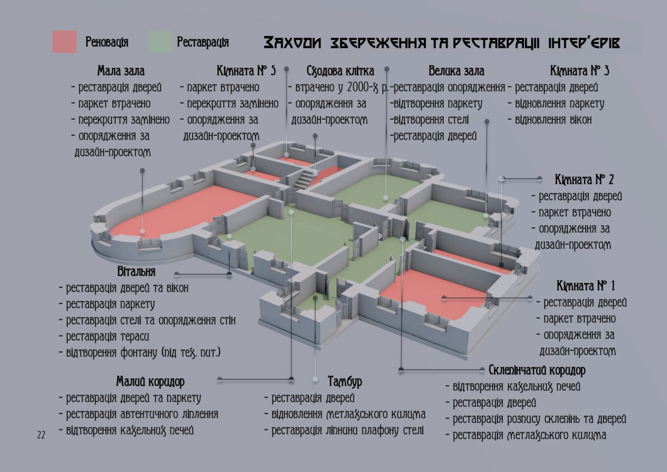 Реставрація інтер’єру передбачатиме відновлення оригінальних дверей, відтворення втрачених кахельних печей, опорядження стін тощо.