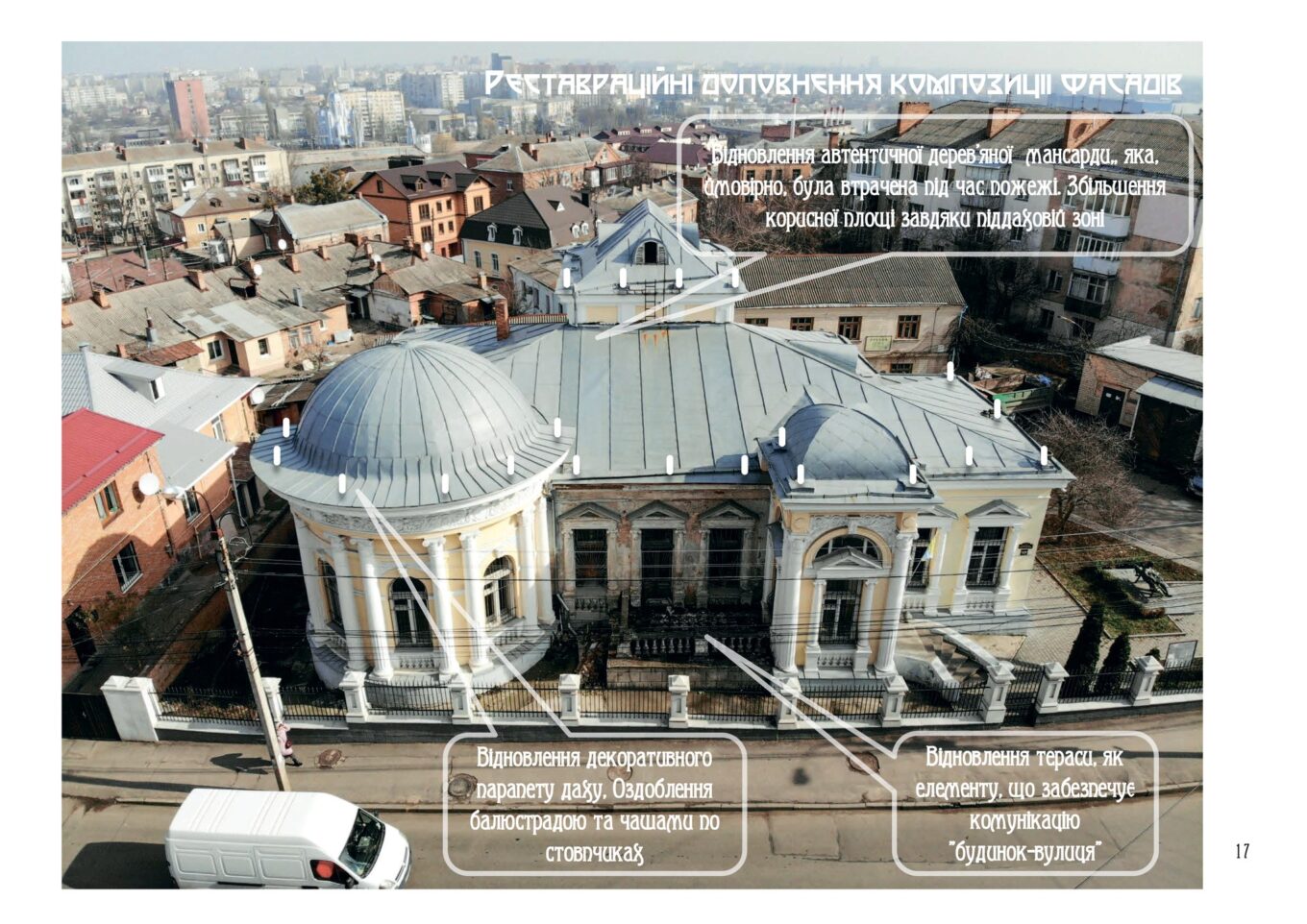 Проєкт передбачатиме одразу декілька етапів, серед яких – заходи з опорядження екстер’єру, реставраційні доповнення композиції фасадів, збереження та відновлення інтер’єрів тощо.