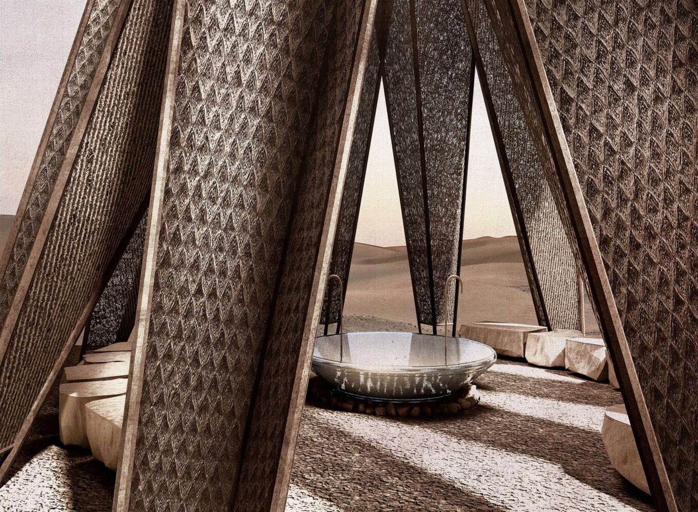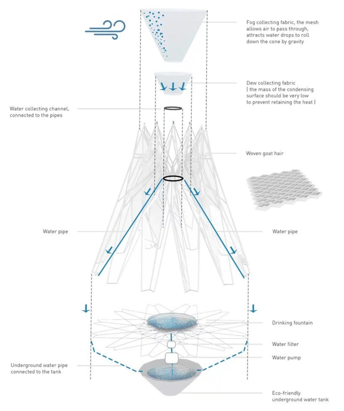 Днем темное полотно поглощает тепло, а в холодные пустынные ночи – возвращает. Во время дождя или снега шерстяная ткань разбухает и становится непроницаемой для осадков. В круглое отверстие вверху павильона встраивается воронка из полотна с гидрофильными свойствами, которая работает как водяной фильтр, собирая дождевую воду и влагу тумана. Вода накапливается в подземном резервуаре, чтобы затем поступить в каменную чашу из которой могут пить люди и животные. Эта же вогнутая плоскость может служить огневой ямой, а на каменных плитах можно сидеть и лежать.
