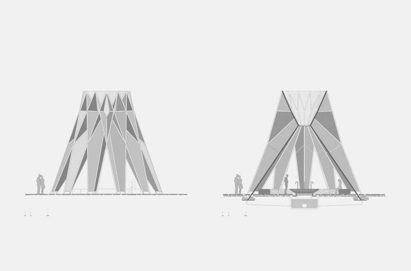 «Использование местных природных материалов для сбора воды делает этот павильон энергоэффективным пространством с замкнутым циклом эксплуатации. Он не наносит ущерб окружающей среде, выглядит ее органичным элементом и создает комфортные условия для путешественников» – говорят архитекторы.