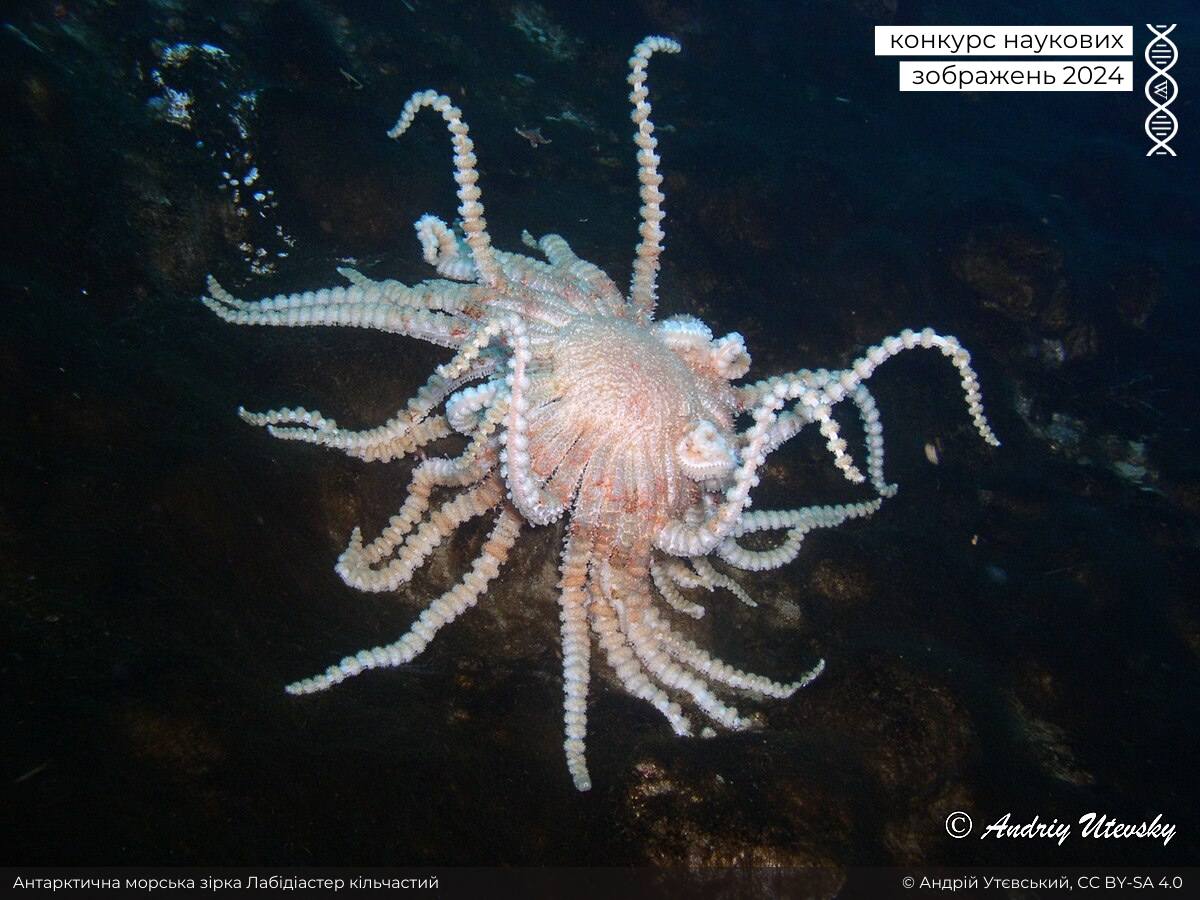 Друге зображення – антарктична морська зірка Лабідіастра кільчаста, хижачка глибин.