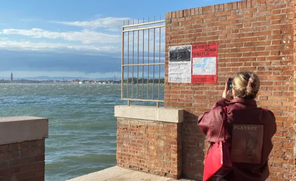 Український павільйон у співпраці з креативною агенцією Bickerstaff.734 на 60-й Венеційській бієнале розповсюдив по всьому місту мапи бомбосховищ Венеції як нагадування, що війна може бути ближче, ніж здається.