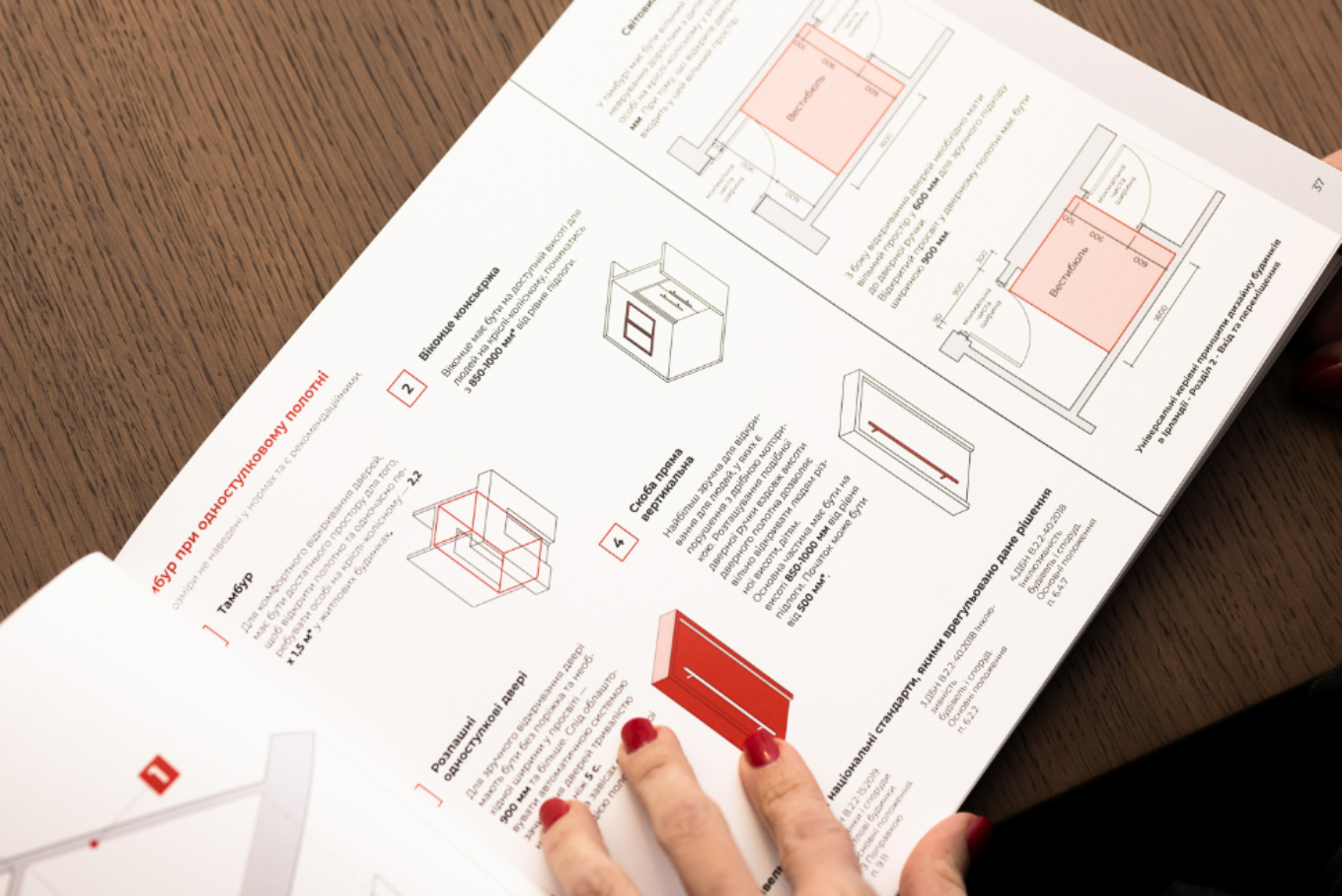 В альбомі не тільки представлені рішення із схемами та замірами для проєктування — там простими словами пояснюють, які нюанси потрібно враховувати для різних людей та як адаптувати простір для них. Адже проєктувальникам потрібно розуміти людське різноманіття, щоби створити справді комфортний простір. Щоб зібрати цю інформацію, команда провела консультації з багатьма вузькопрофільними фахівцями, науковцями та представниками маломобільних груп населення.