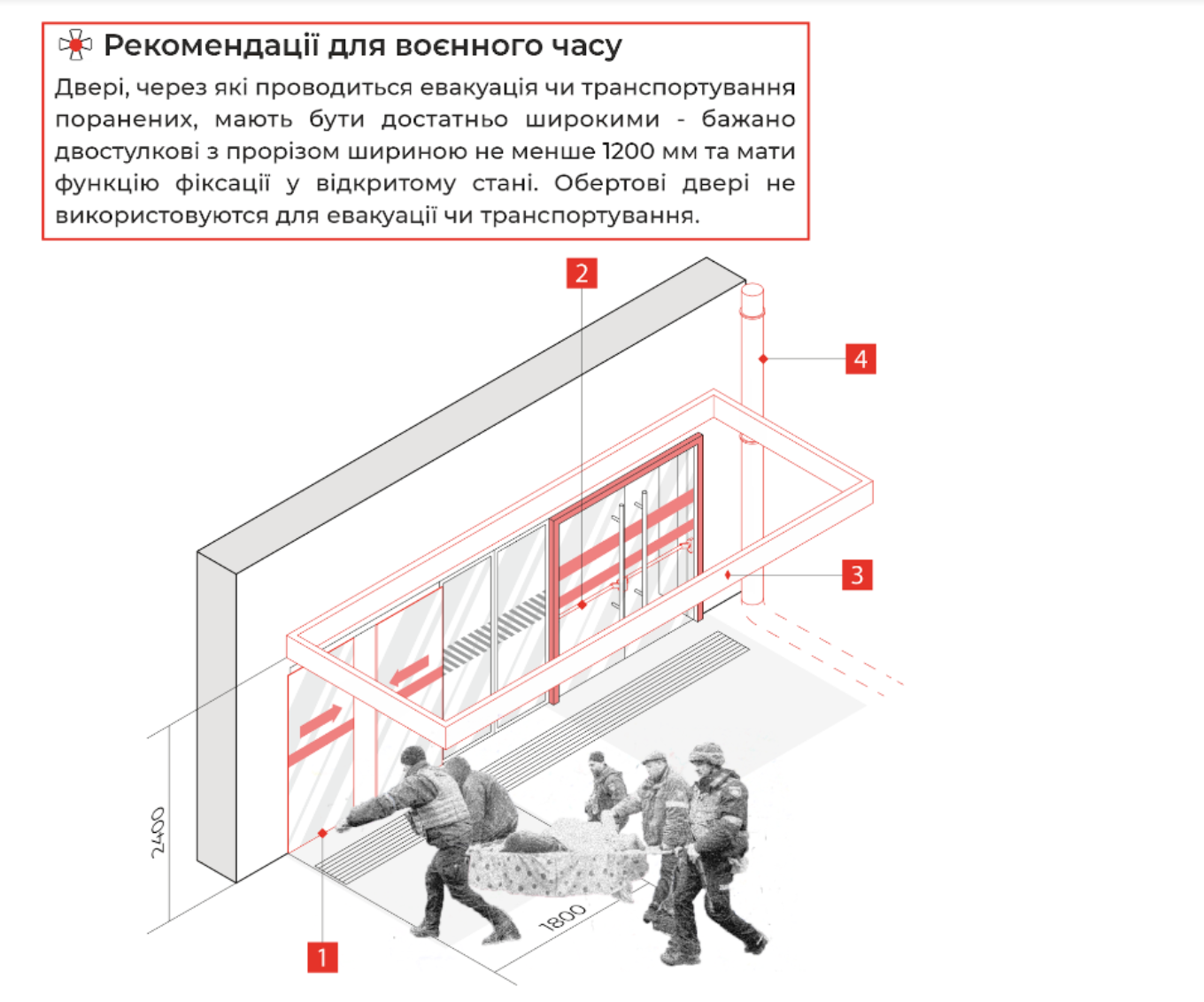 Посібник адаптували до воєнного часу і додали рекомендації, що враховують безпекові потреби: там можна знайти поради, що стосуються дверей для евакуації, світломаскування й обладнання шпиталів і штабів, встановлення стел екстреної допомоги, місця для гуртування громади під час вимкнення електроенергії чи газу, кімнат сенсорного розвантаження для тих, хто має чутливість до світла та звуків, облаштування прихистків для ВПО та відповіді на інші актуальні теми.