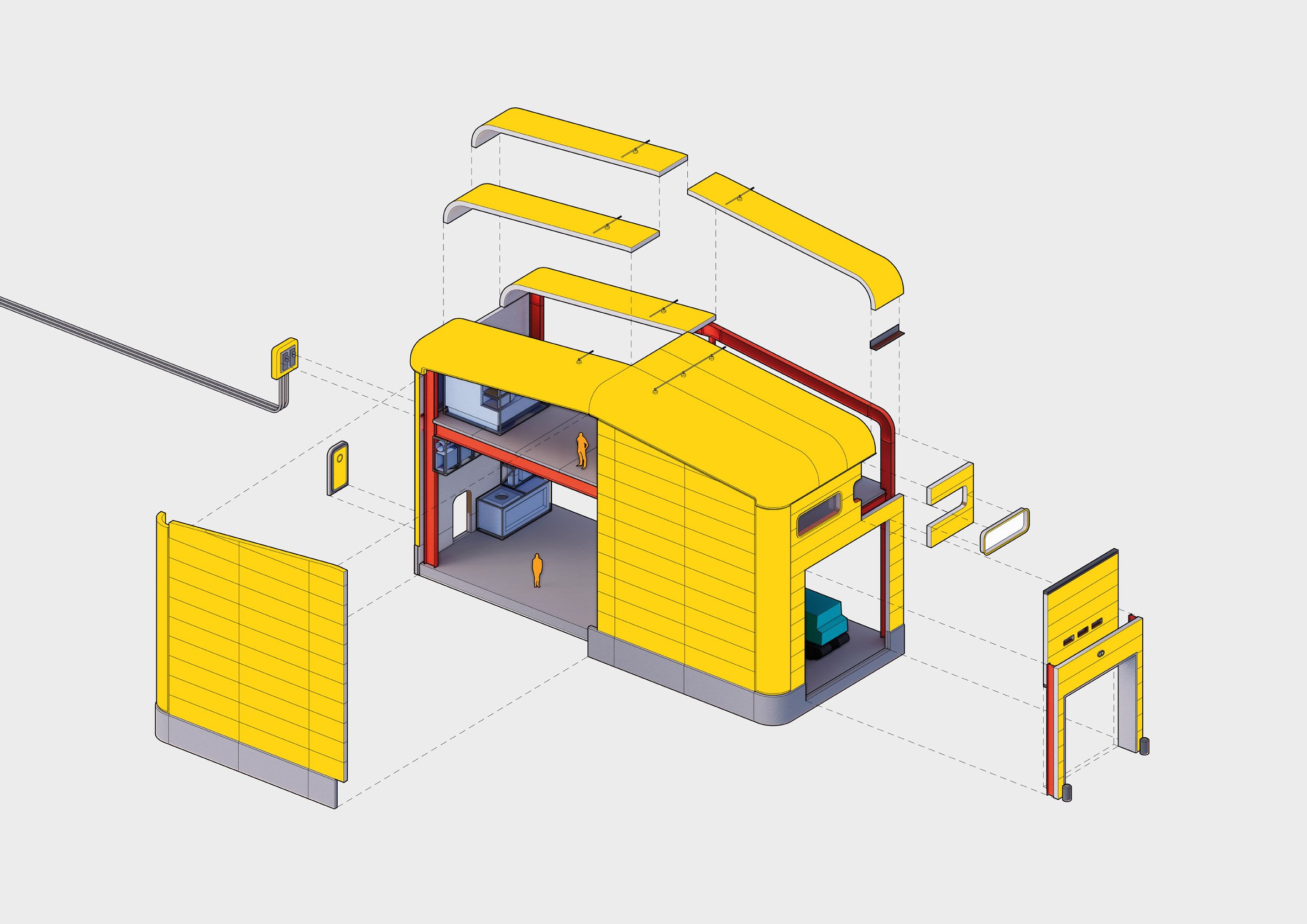 На першому поверсі облаштують подвійну за висотою майстерню з трьома великими воротами для різних транспортних засобів станції. Поруч розмістять склад запчастин і енергетичний блок, а над ними — інженерний офіс з оглядом на головний простір та територію бази.