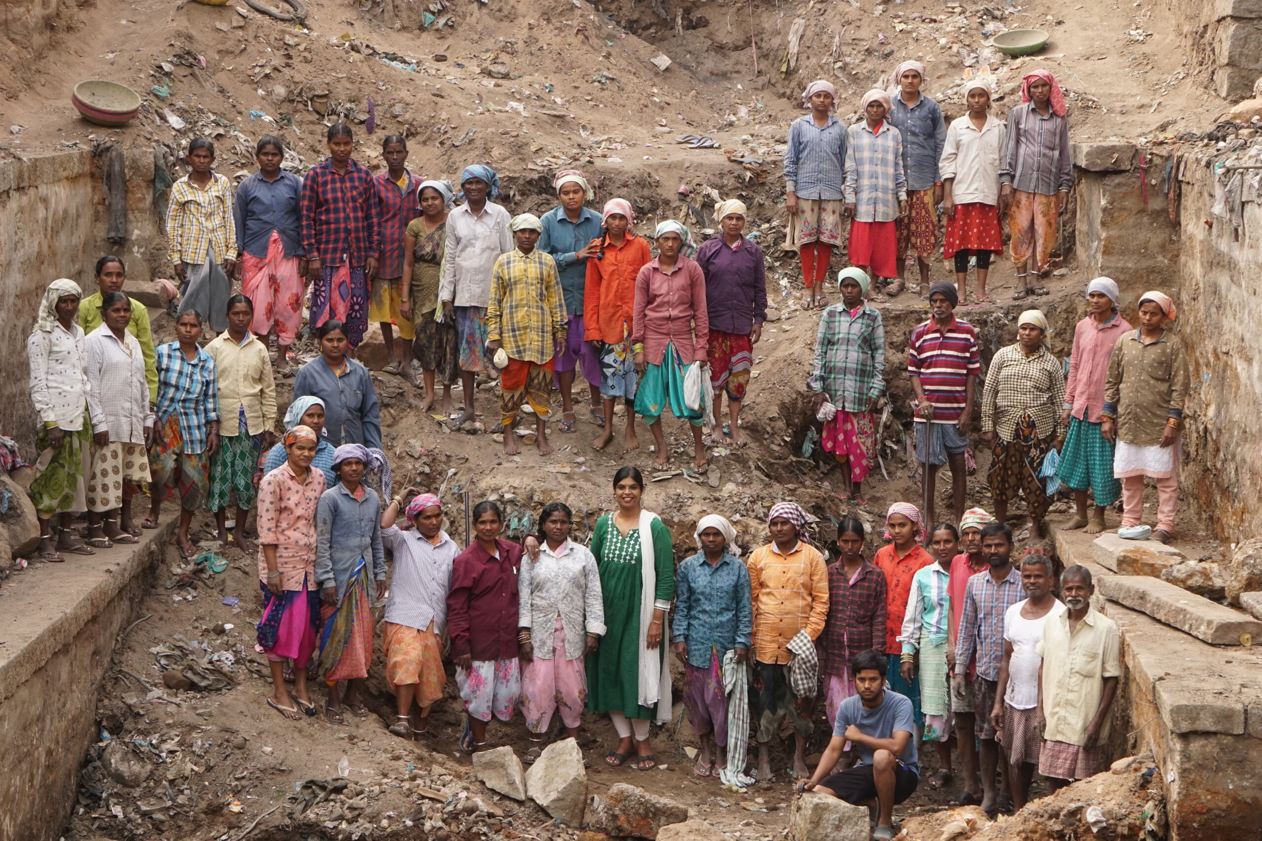 Калпана Рамеш, архітекторка, яка очолила ініціативу з відновлення ступінчастих колодязів Теланґани (у центрі, в зеленому), разом із жінками та чоловіками, які допомагали очищати територію. Фото: Kalpana Ramesh