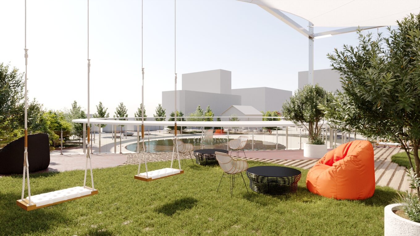 У парку розташована зона для відпочинку з перголою, що дає тінь в сонячний день, а серцем композиції є сухий фонтан зі скульптурою, що символізує свободу. Для освітлення фонтану використовуються точкові світильники, також підсвічені струмені води.