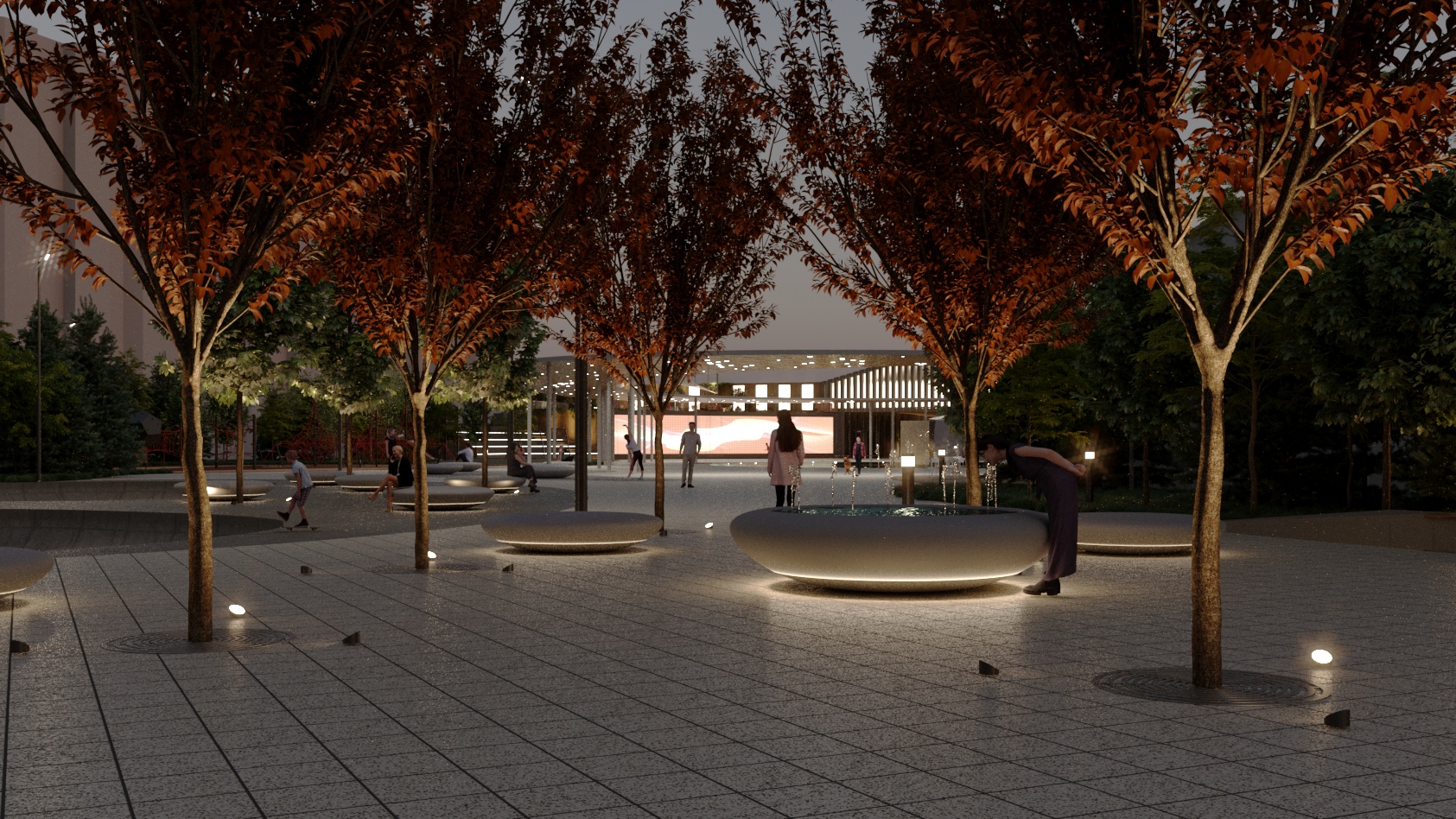 У парку розташована зона для відпочинку з перголою, що дає тінь в сонячний день, а серцем композиції є сухий фонтан зі скульптурою, що символізує свободу. Для освітлення фонтану використовуються точкові світильники, також підсвічені струмені води.