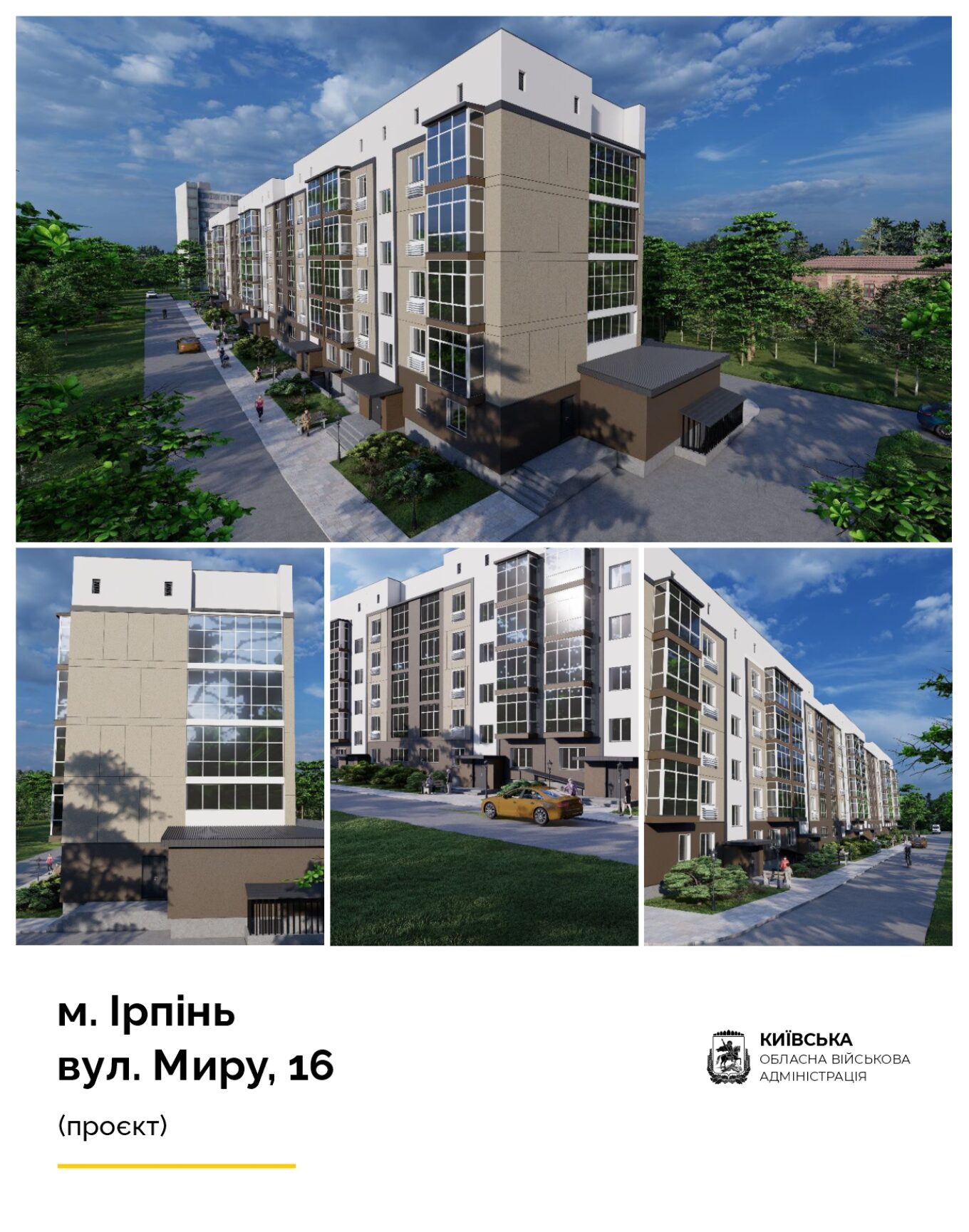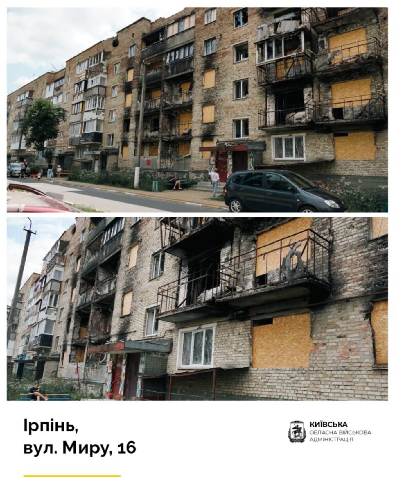 Зокрема, йдеться про будинок на вул. Миру, 16. Це один із численних житлових будинків на Київщині, який пошкоджений внаслідок бойових дій. Три під’їзди з шести дістали значних пошкоджень.