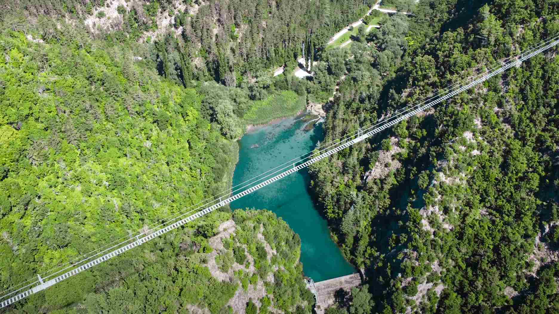 Міст звисає на висоті 175 метрів над долиною, заповненою озерами, та з’єднує села Селлано та Монтесанто.