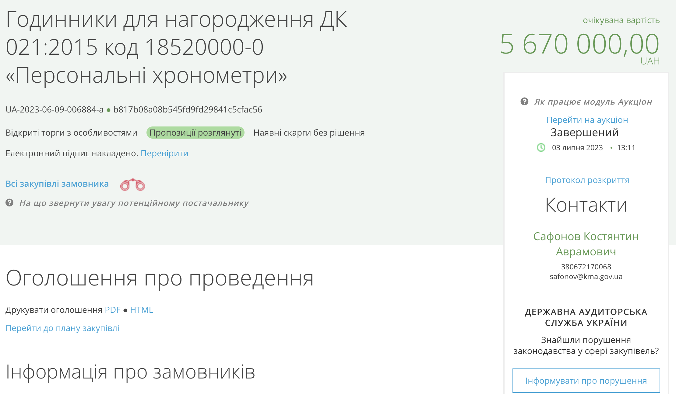 Завод має виготовити та поставити 1500 чоловічих і жіночих годинників по 3360 грн за кожен. Постачальником планують обрати ТОВ “Київський годинниковий завод”.