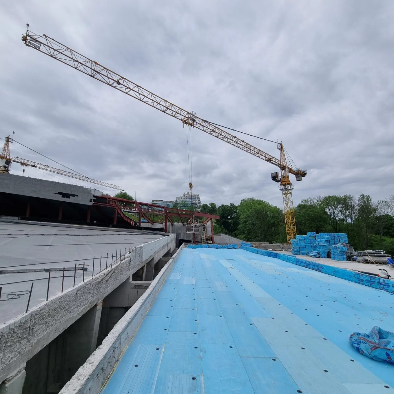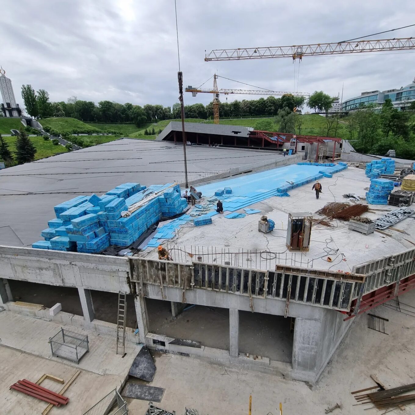 Роботи на будівельному майданчику показав інфраструктурний оглядач Павло Авдокушин, пишуть в Конфедерації будівельників України. На даху Національного музею Голодомору-геноциду в Києві вже монтують утеплювач.