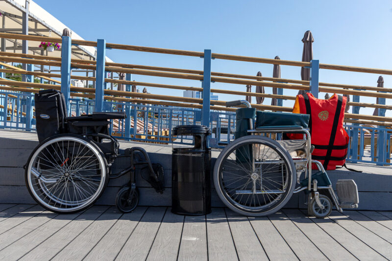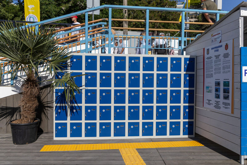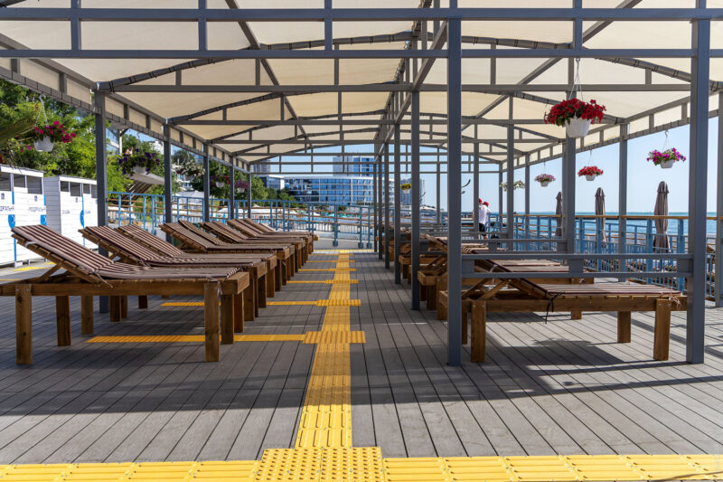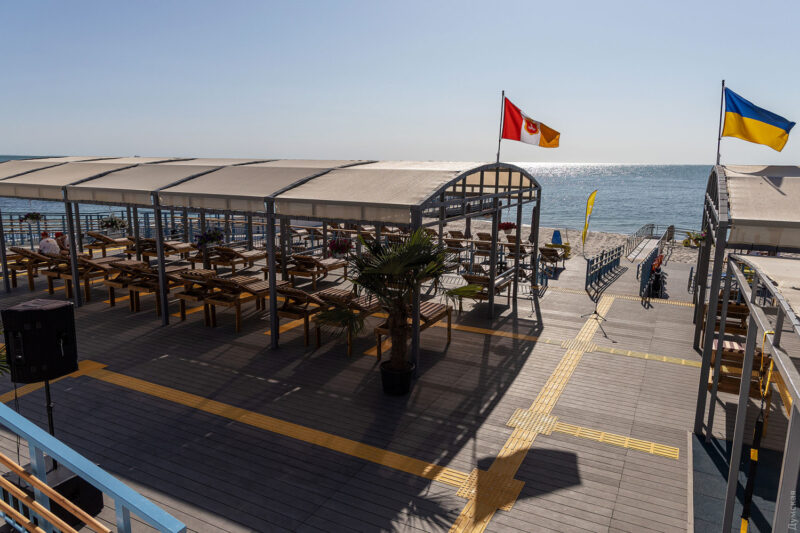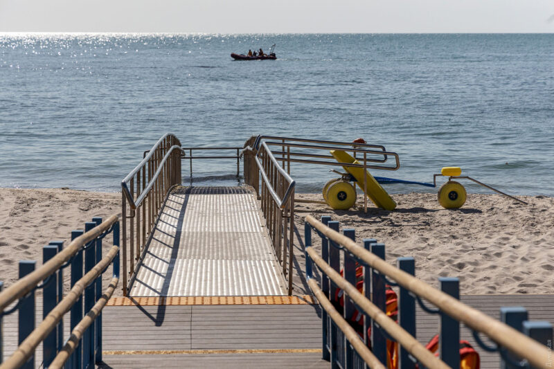 На інклюзивному пляжі облаштовані спеціальні пандуси, зокрема для спуску в море, сучасні туалети і душові кабіни з урахуванням потреб людей з інвалідністю.