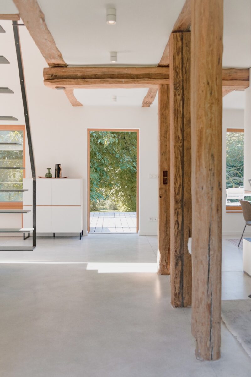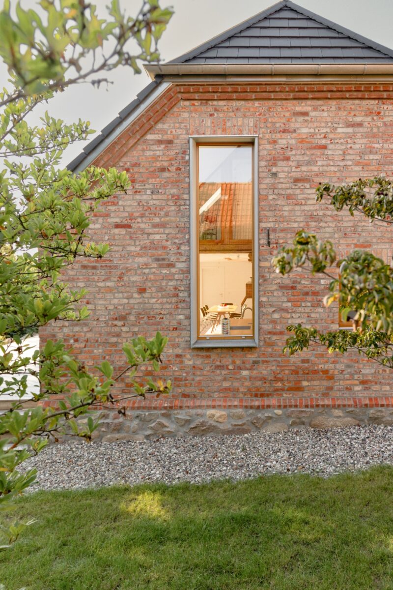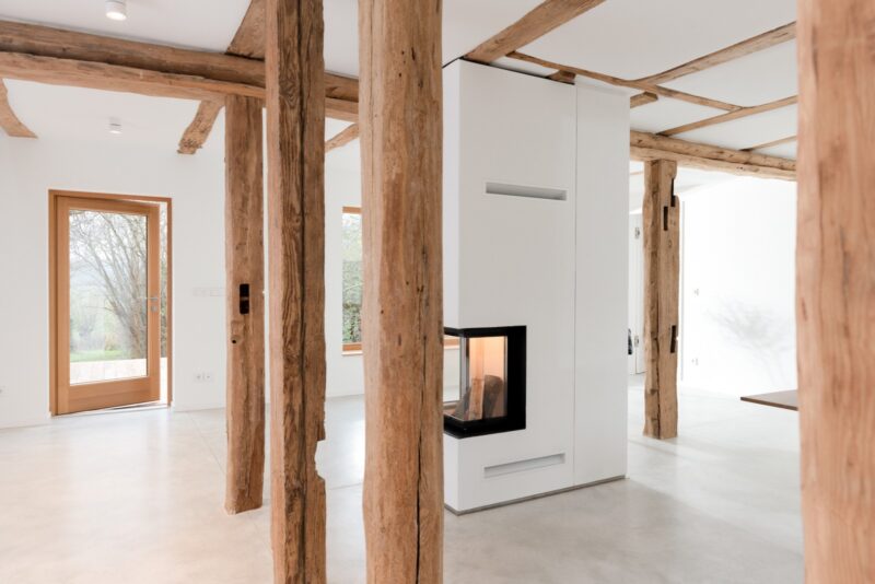 Фасад відтворили максимально близько до початкового вигляду, і тепер будинок знову гармонійно вписується у сільський ландшафт. Єдиним сучасним акцентом стали великі вікна та жалюзі, що додають легкості та світла.