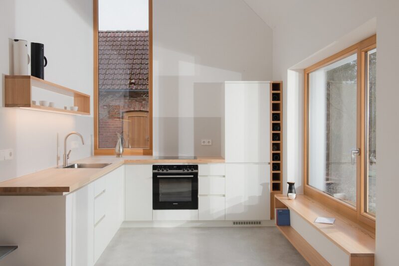 Планування будинку відкривається від більш закритої фронтальної частини до саду, де розташовано відкриту денну зону з двосвітним простором. З боку вулиці збережено низькі глиняні стелі, відреставровані вручну. Усередині — масивна дерев’яна конструкція, яку тепер підкреслює вертикальна щілина фасаду, що наповнює простір денним світлом.