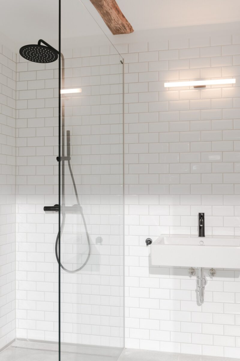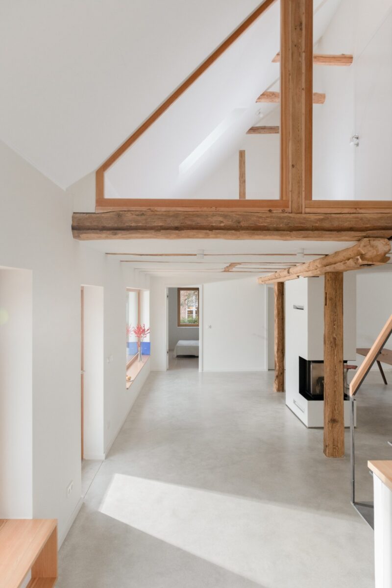 Скляні перегородки візуально об’єднують поверхи, створюючи несподівані ракурси, а бетонна підлога з підігрівом і ретельно виконана внутрішня ізоляція поєднуються з автентичними елементами XIX століття.