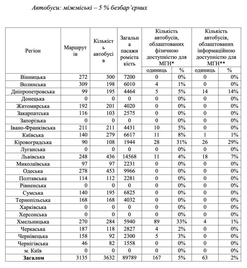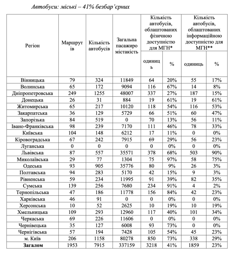 Так, найвищий відсоток облаштованих фізичною доступністю міських автобусів у Миколаївській області – 97%, найнижчий – у Черкаській області із 0%.