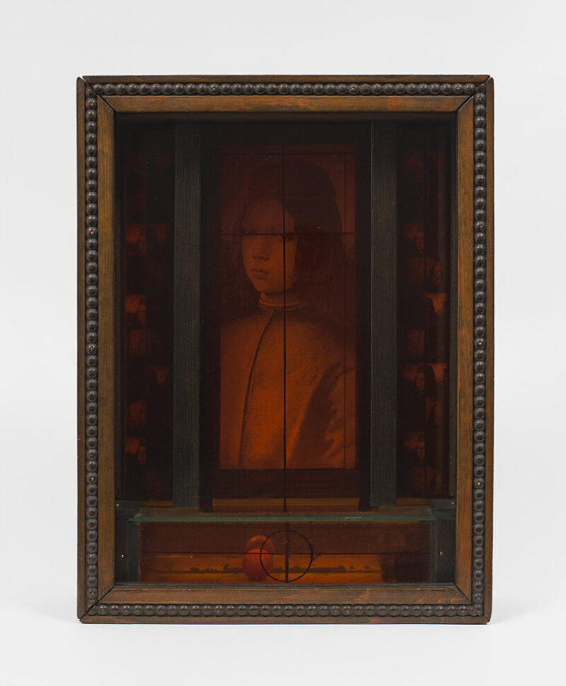 У відтвореній студії представлені ключові shadow boxes Корнелла. Серед них Pharmacy (1943), натхненна старовинною аптекарською шафою і колись належна Тіні та Марселю Дюшанам; Untitled (Pinturicchio Boy) (бл. 1950) з серії Medici, де ренесансний портрет поєднується з мапами й дерев’яними іграшками; A Dressing Room for Gille (1939), що відсилає до П’єро Ватто з Лувру; та Blériot II (бл. 1956), присвячена піонеру авіації Луї Блеріо. У цій експозиції роботи сприймаються не як поодинокі об’єкти, а як вузли складної мережі асоціацій, ритуалів і нав’язливих мотивів.