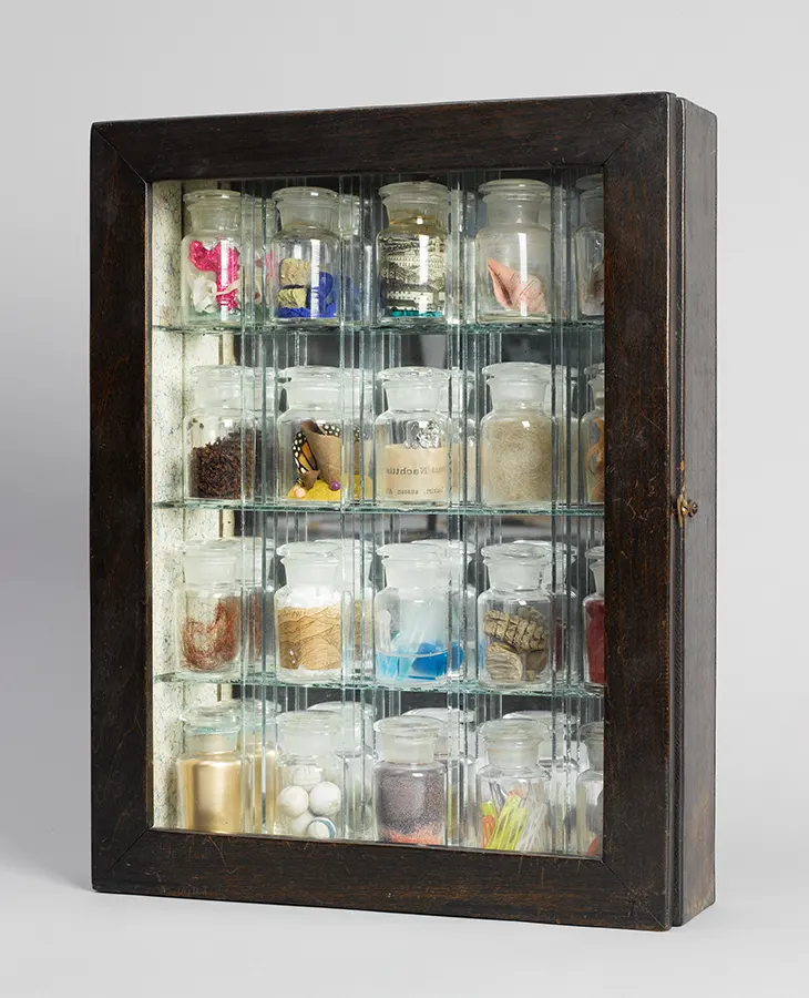 Полиці з вибіленими коробками, бляшанками та шухлядами наповнені понад 300 об’єктами з особистої колекції Корнелла: гравюрами, пір’ям, мармуровими кульками, мапами, іграшками, мушлями та паперовими фрагментами — тим, що сам художник називав своїм «відділом запасних частин». Саме з цих дрібних знахідок народжувався його унікальний візуальний всесвіт.