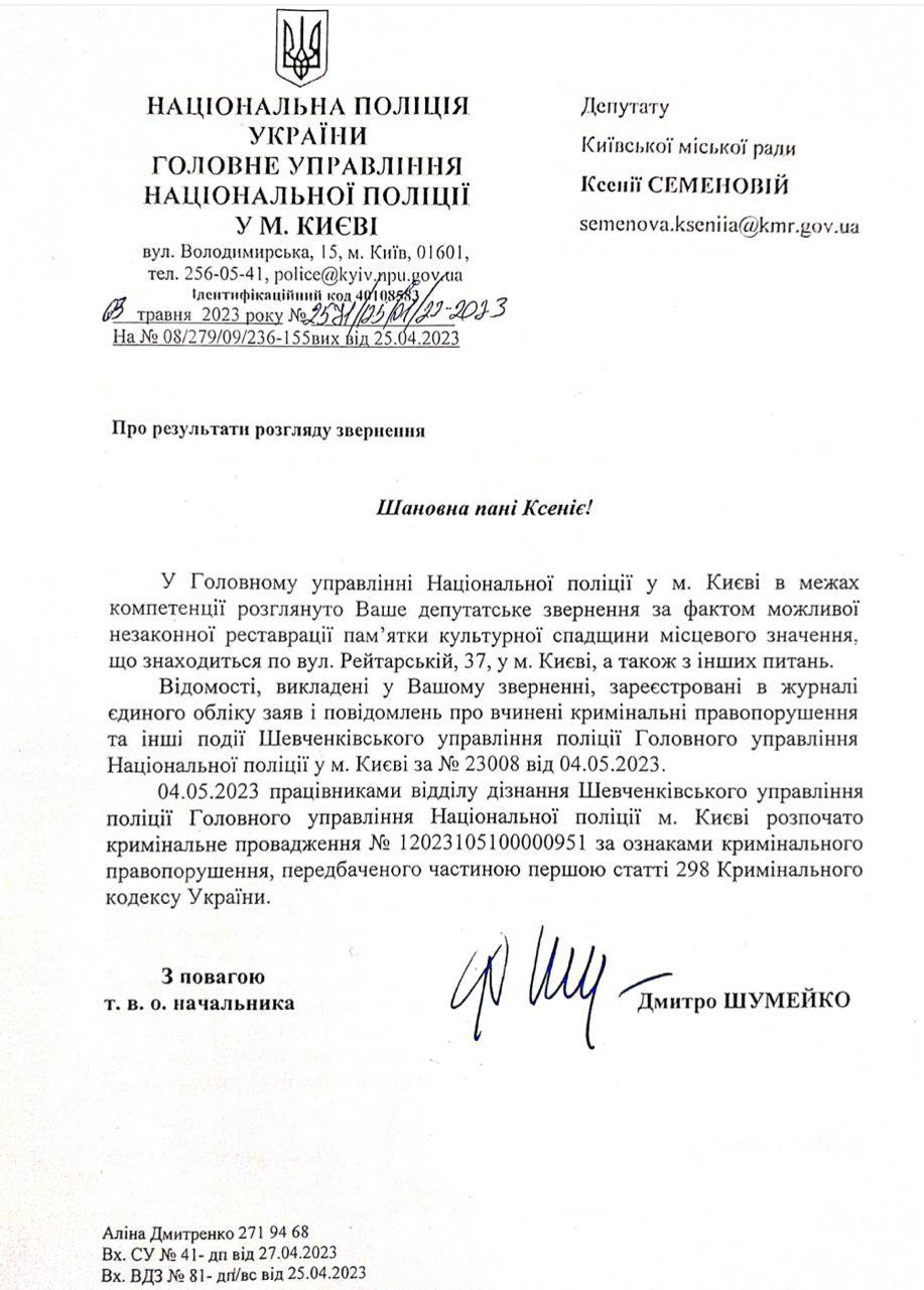 Наразі поліцією відкрите кримінальне провадження за частиною першою статті 298 Кримінального кодексу (незаконне проведення пошукових робіт на об’єкті археологічної спадщини та знищення, руйнування чи пошкодження об’єктів культурної спадщини).