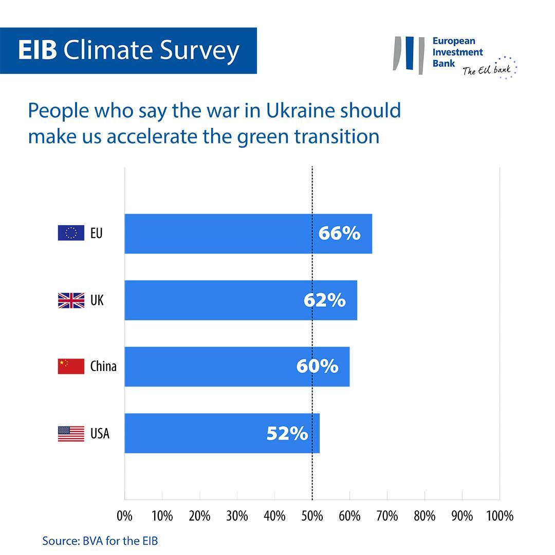 Ключові висновки з опитування свідчать, що більшість людей вважають, що війна в Україні прискорить перехід до зеленої енергетики. Зокрема, цієї думки дотримуються 66% опитаних європейців, 62% британців, 60% китайців і 52% американців, повідомляє видання The Mayor.