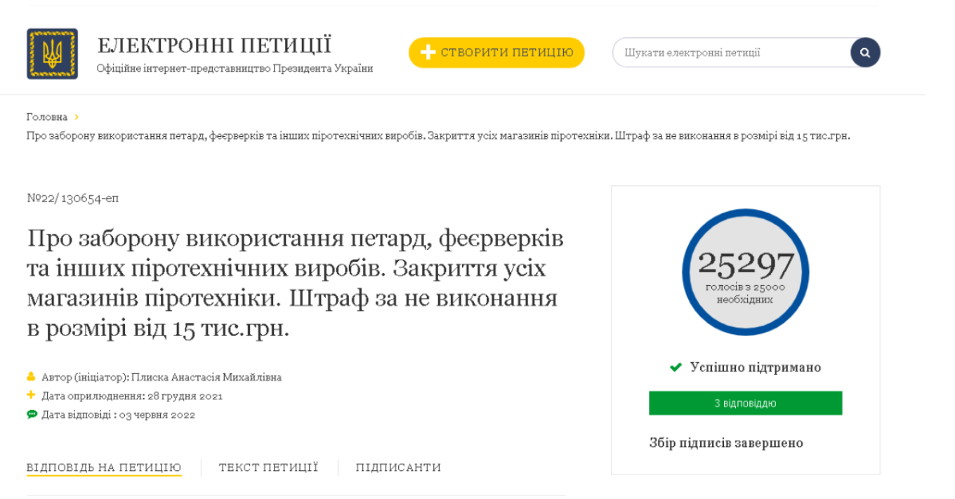 Варто зазначити, що петицію “Про заборону використання петард, феєрверків та інших піротехнічних виробів. Закриття усіх магазинів піротехніки” створили ще до початку повномасштабного вторгнення – 28 грудня 2021 року. У ній авторка запропонувала запровадити для порушників адміністративне покарання у вигляді штрафу, який складає 15 тисяч гривень. Звернення зібрало понад 25 тисяч необхідних голосів і опинилось на розгляді у президента.