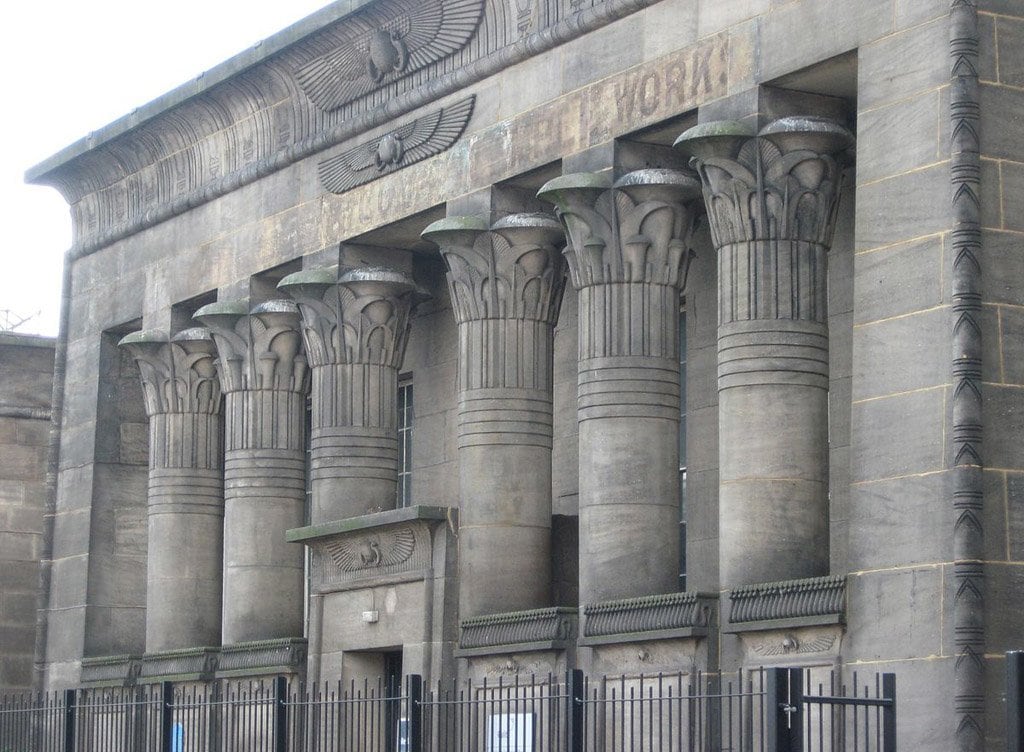 К строительству Маршалл привлек архитектора Джозефа Бономи Младшего, который в 1835 году вернулся из путешествия в Египет. Впечатленный видами храма в Эдфу, архитектор решил, спроектировать фасад фабрики в египетском стиле. Он украсил здание иероглифами и колоннами, которые венчают капители в форме цветка лотоса. Джон Маршалл сам также увлекался египтологией поэтому горячо поддержал проект.