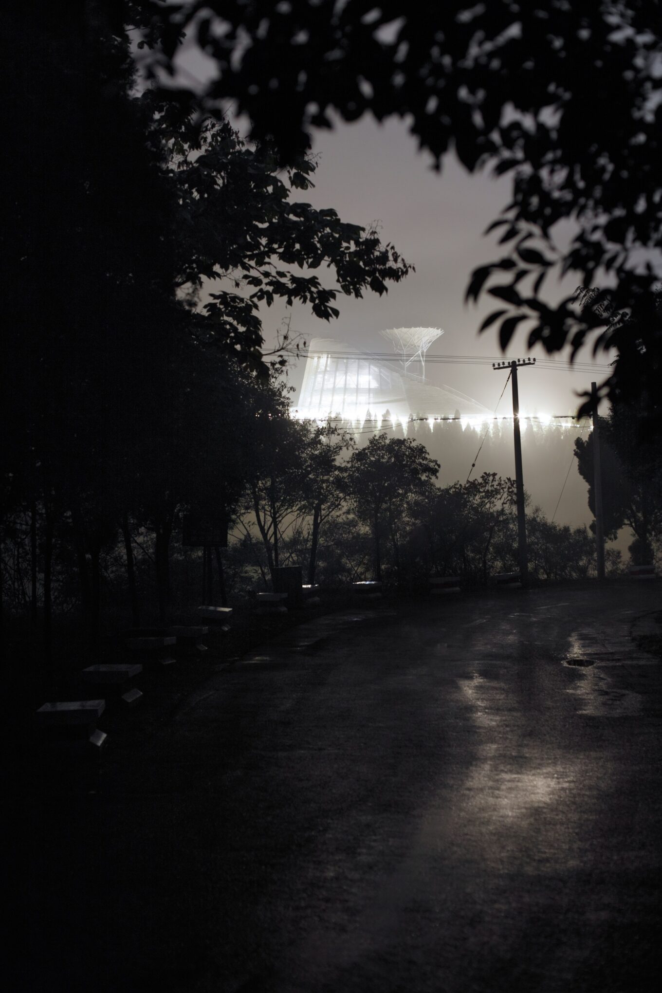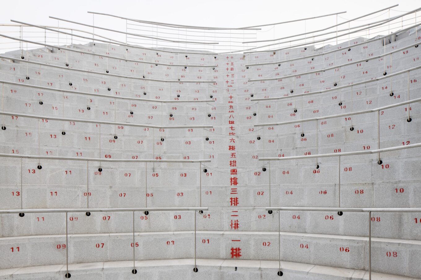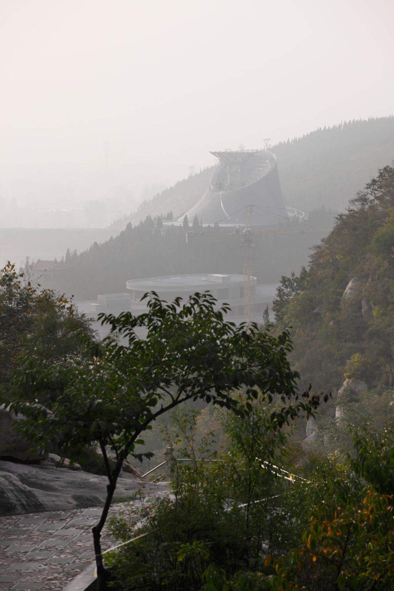 Камень и дерево – эти два архетипичных для китайской культуры образа стали основой дизайна здания театра. Его форма – усеченный конус из центра которого поднимается аэродинамическая труба с ветвистой структурой. Внешняя оболочка здания служит одновременно и гигантской лестницей. Ступени по спирали плавно поднимаются к смотровой площадке и трансформируются в трибуны для зрителей. Каменные горизонтали амфитеатра издалека создают эффект словно театр – обветренная скала, венчающая Суншань.
