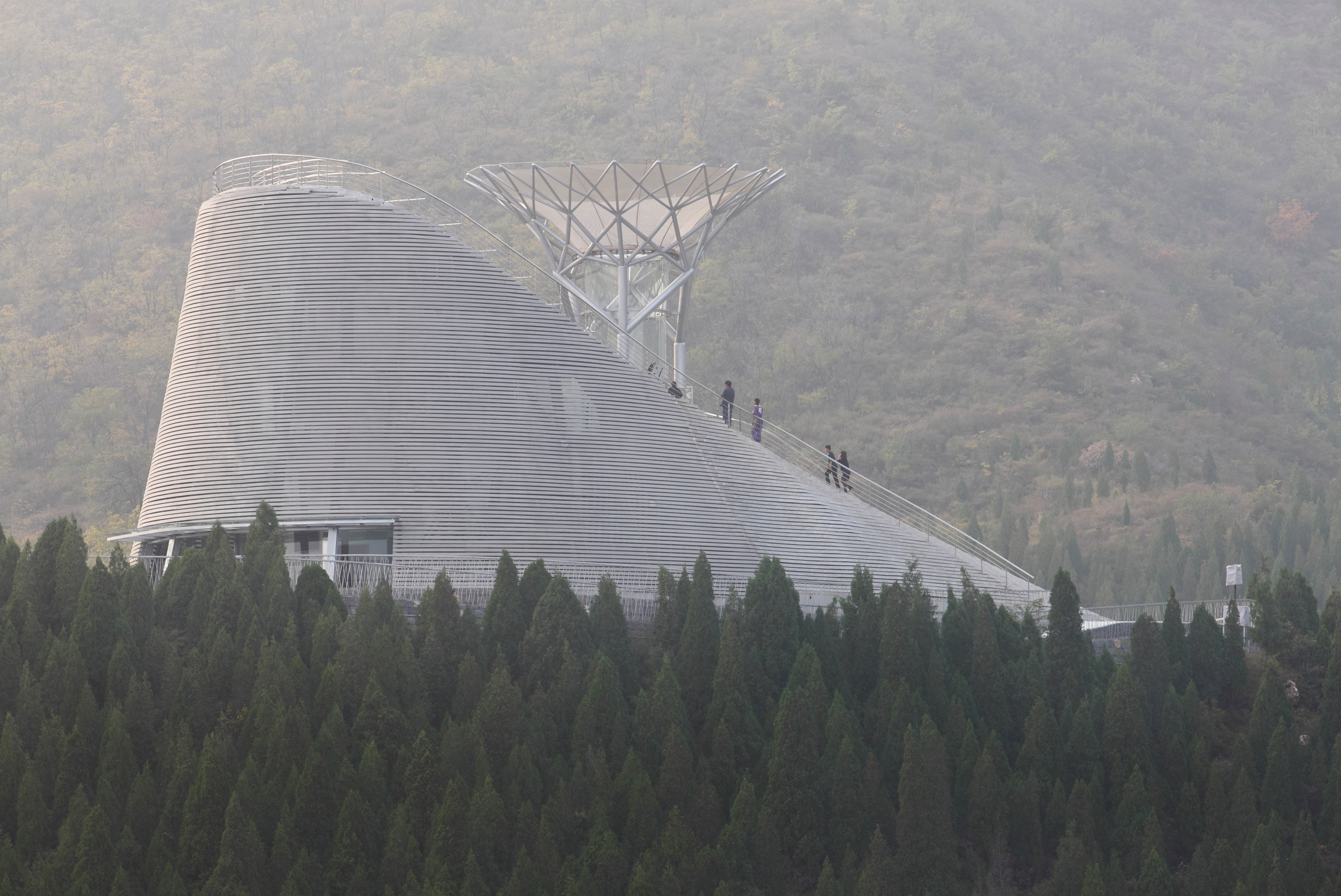 Камень и дерево – эти два архетипичных для китайской культуры образа стали основой дизайна здания театра. Его форма – усеченный конус из центра которого поднимается аэродинамическая труба с ветвистой структурой. Внешняя оболочка здания служит одновременно и гигантской лестницей. Ступени по спирали плавно поднимаются к смотровой площадке и трансформируются в трибуны для зрителей. Каменные горизонтали амфитеатра издалека создают эффект словно театр – обветренная скала, венчающая Суншань.